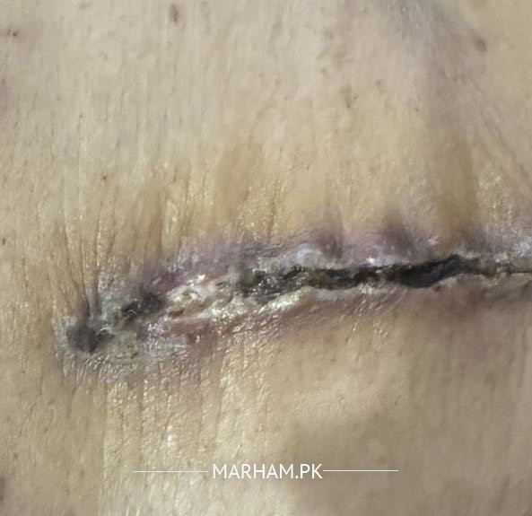 Aslamaolikum Doctors. After bypass syrgery My mother is experiencing severe, sudden pain in the right side of her back, which radiates to her right arm and fingers. The pain is unbearable, even though she takes painkillers three times a day. Additionally, that part of her body feels numb. At the site of her chest stitches, the last stitch is discharging a mild fluid. Kindly guide me if this is a serious issue or not. I will also upload a picture below for reference. Kindly suggest treatment.