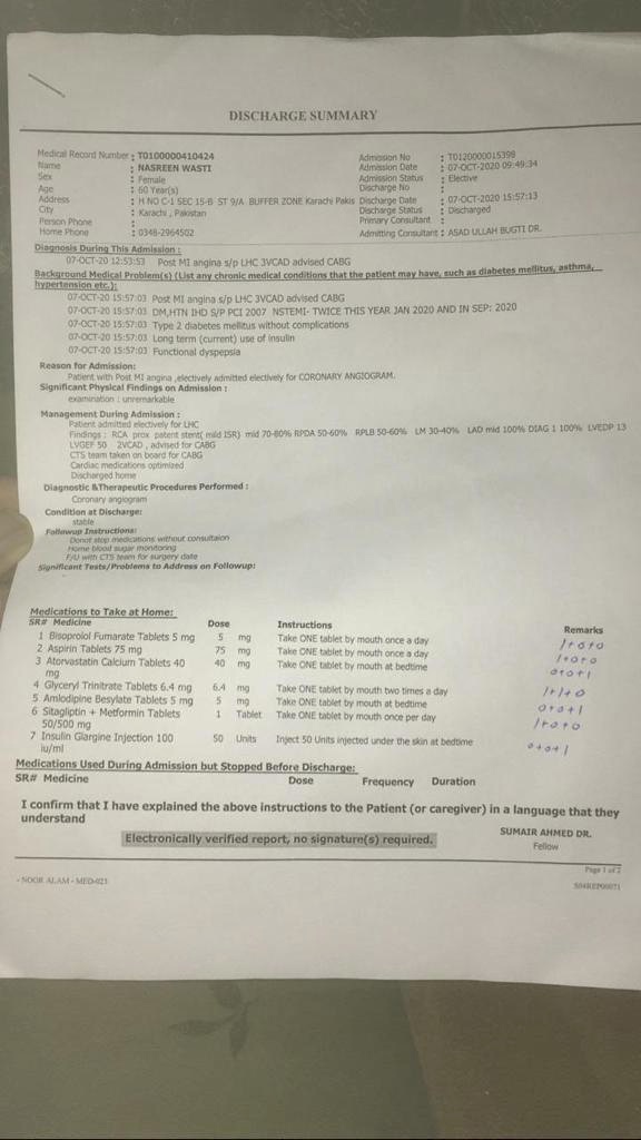 Known Patient of DM ,NSTEMI, TVD,discharged from hospital on 7th Oct, advised CABG, kindly update the Angiography report, BP levels and blood Sugar levels with have to continue the same medication and don't hurry in doing walk for 40 minutes, eat healthy diet, control sugar and blood me for further advice if Patient symptomatic...
