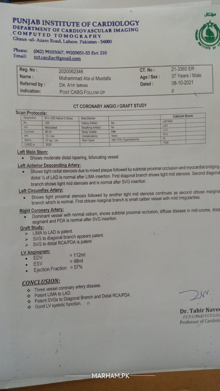 I m 37 year old. my CABG was performed last Dec. 2020. I get well after CABG and started walking 6 km daily with speed 120 step per minute. After eight month of CABG l felt chest pain . My ECG was normal but TROP T test was positive. Now I feel heaviness by fast walking. my fresh CT angeo report is attached . plz recommend some treatment for me