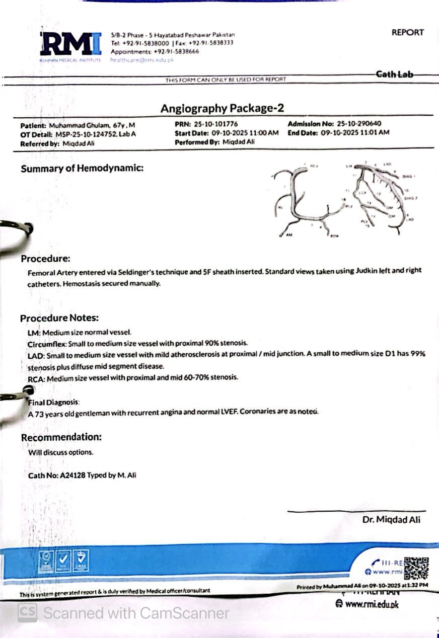 Salam doctor sb, kindly check my father angiography report and guide about medical treatment. One doctor recommends stent procedure and other medications. Need your guidance.