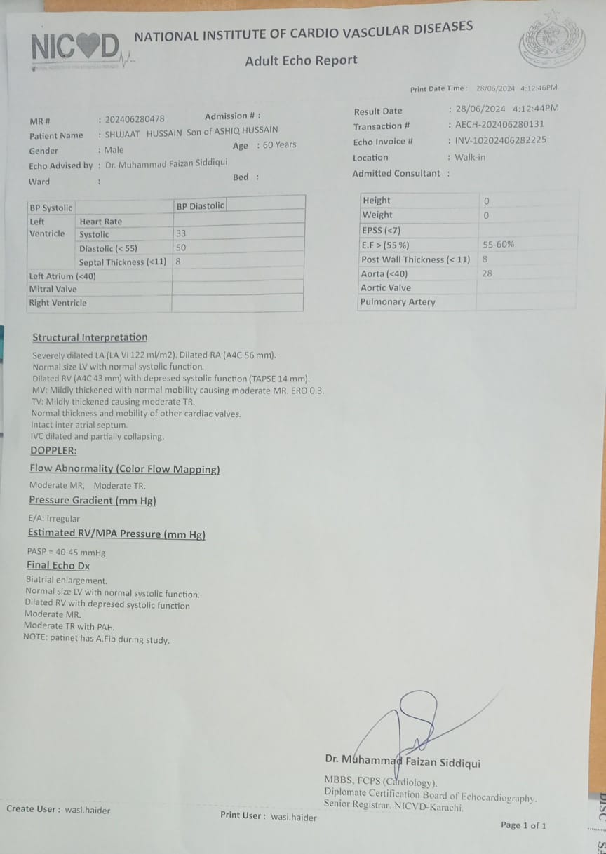 Hello Doctor, Hope you are fine. My father age 60 was facing some short breathing issue due to which we conducted complete blood and urine test which seems to be normal but in echo there are some changes showing can you please guide me with this and the treatment. Thank you