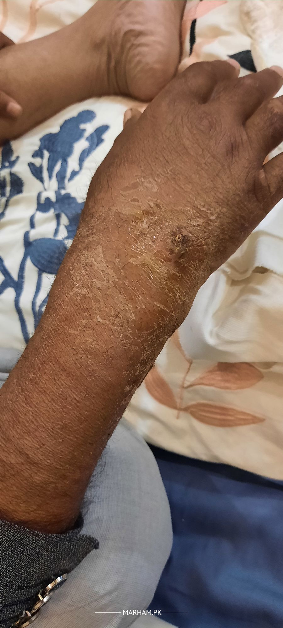 Aoa , My Father had a Car Accident a month ago his right hand bone is fracture from mid 2 sides doc opreated and put the plattes and a wire stiches are removed from one side now he is feeling pain due to dryness i think so doc gave the time next month kindly look at the condition and sugesst should i apply any thing on these wounds he is a debitic patient also please share either its improving. JazakAllah