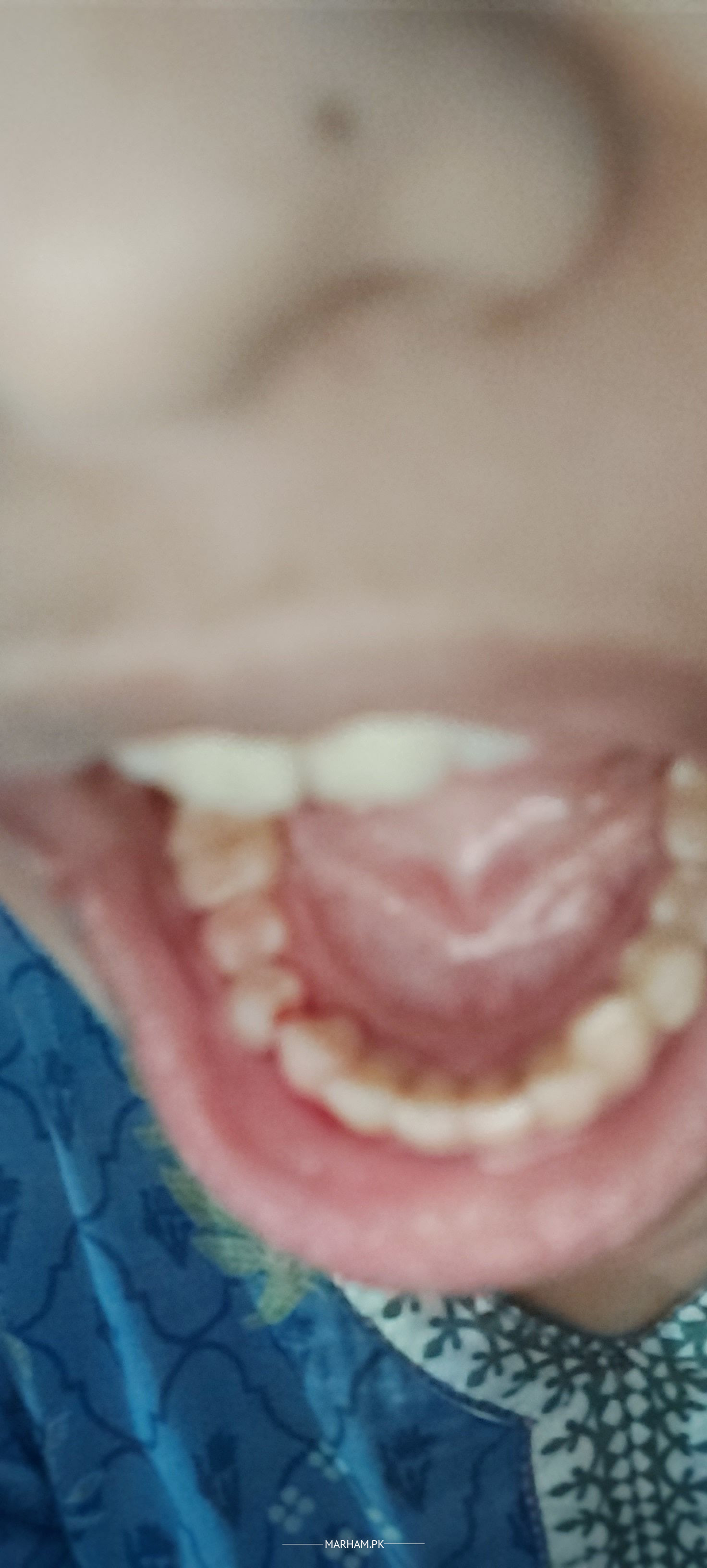 as per the image. it seems Gums infection.plz visit a dentist and get teeth cleaning and polish done.