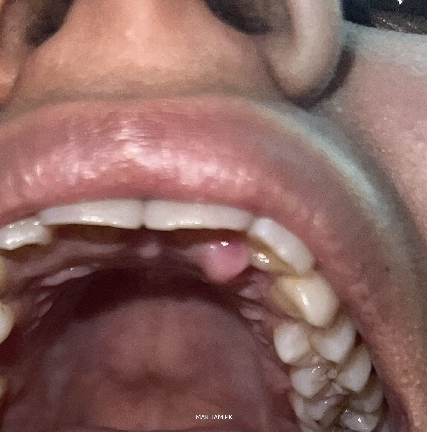 Since some days i was having pain underneath my upper tooth (gum area) usually when i would eat something specially while breaking it now since 2 weeks now Ive developed this bump which isn’t painful to touch but mild tenderness when trying to eat something, I’ve often tried to press it down as i thought it might be just gum and will get better but it’s not getting better. I’ve attached the picture pls let me know if this is serious or needs to be checked by a dentist