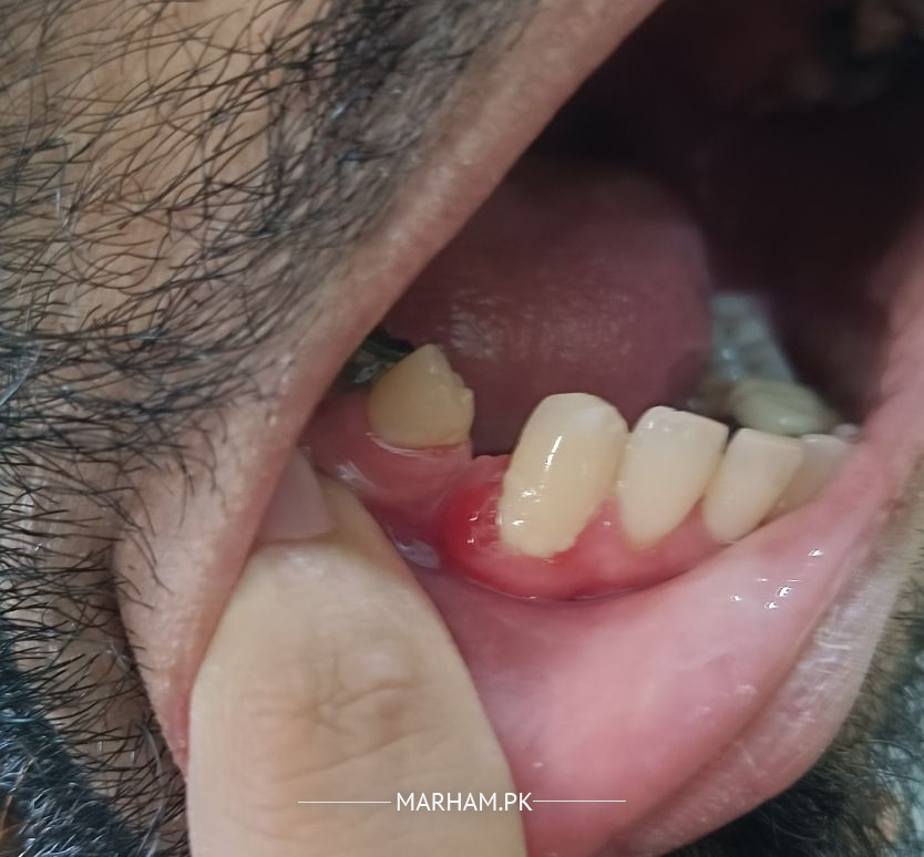 It is inflammed or swollen gum ,warm saline gargles may help local applications of enziclor gel twice daily might also help