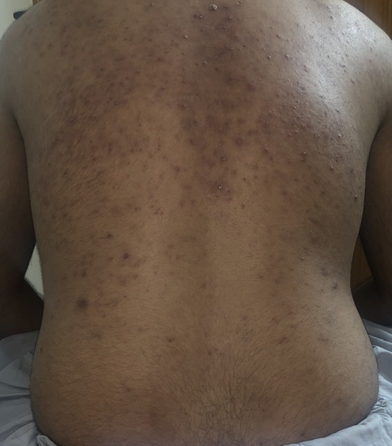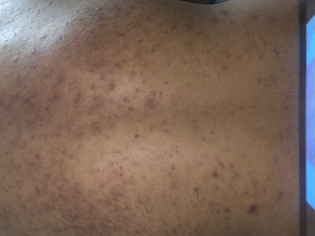 its Trunkal Acne. Regular and persistent treatment is needed for betterment. if you dont want to go to any clinic, you may get appointment through Marham for online consultation with a Dermatologist