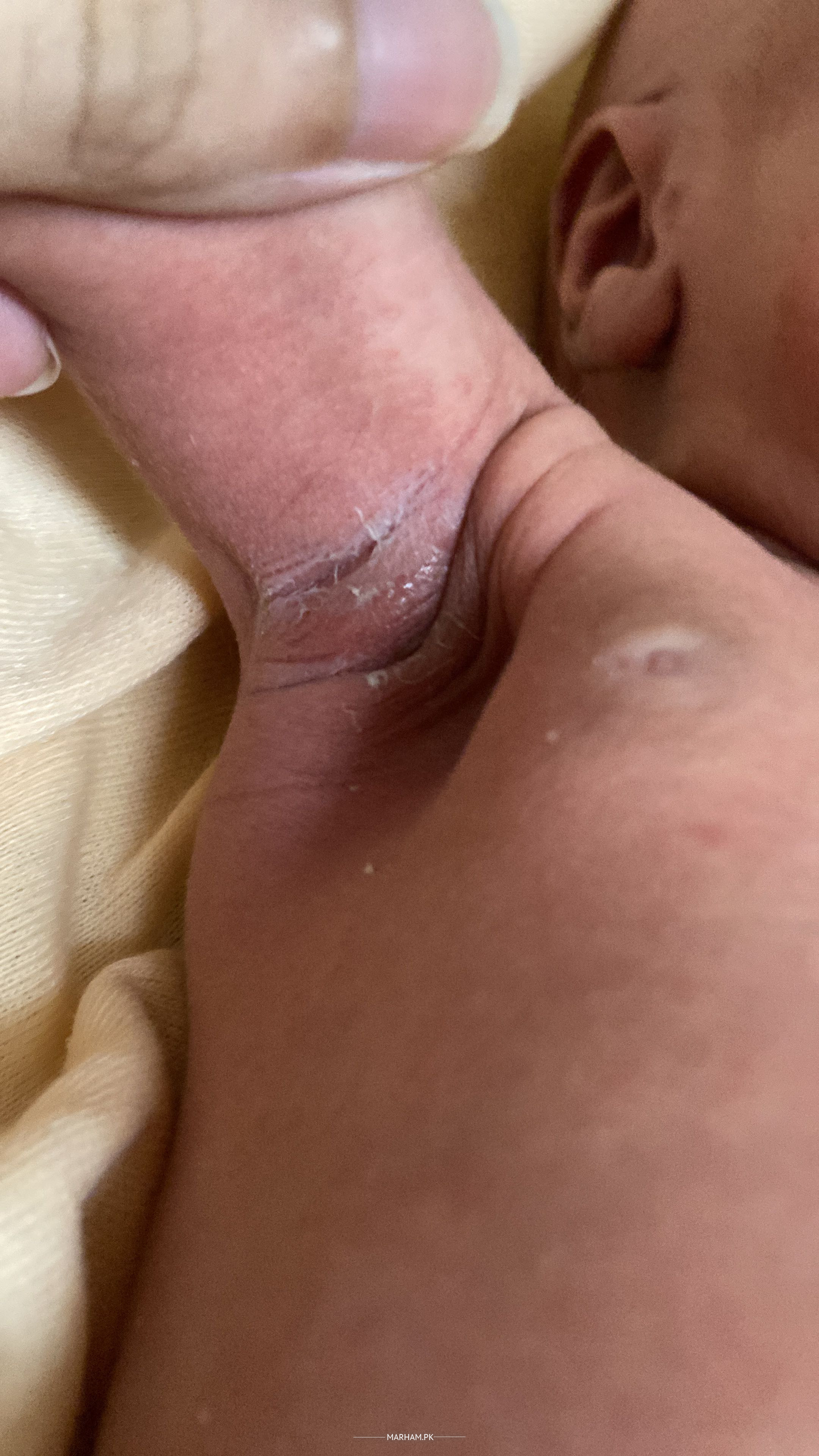 I saw this under my 18 day old’s armpit yesterday. The skin seems red and shiny; also has some soft white stuff on it. I removed most of it before taking a picture. She seems to cry a little more when I apply vaseline on it so maybe it hurts? Please guide me what can this be? I cannot go to a hospital or clinic because my stitches hurt really bad.