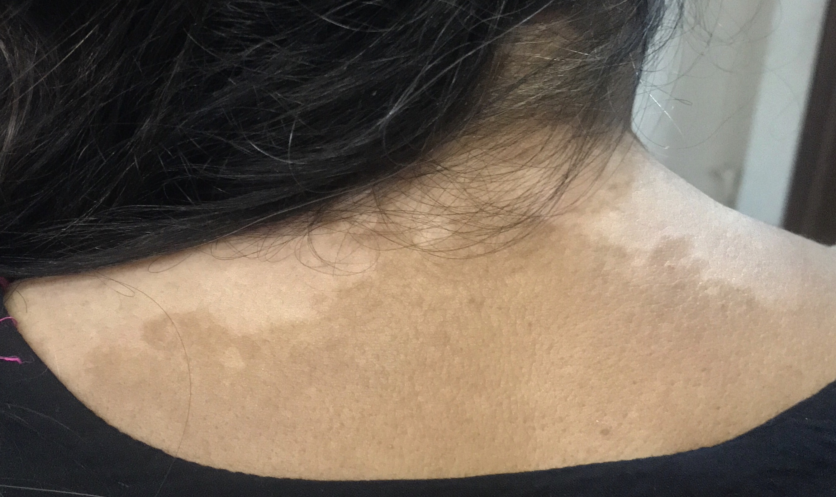 My mom is facing this issue for like 3 years. This is the pic of the back of her has a similar mark on her forehead near the hairline too. It started as a little dot and now has expended. Sometimes iches when exposed to heat, be the sweat causes itching,cant be sure. Mom really worried.