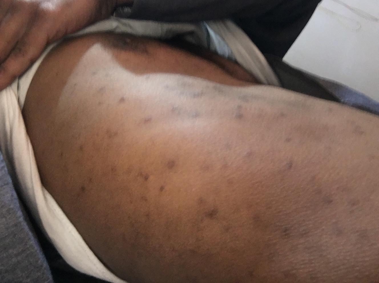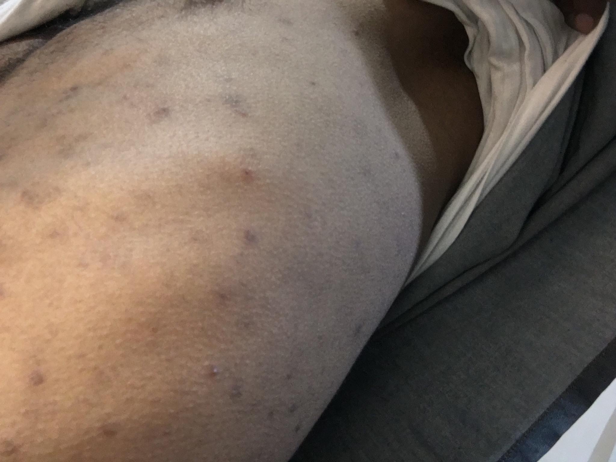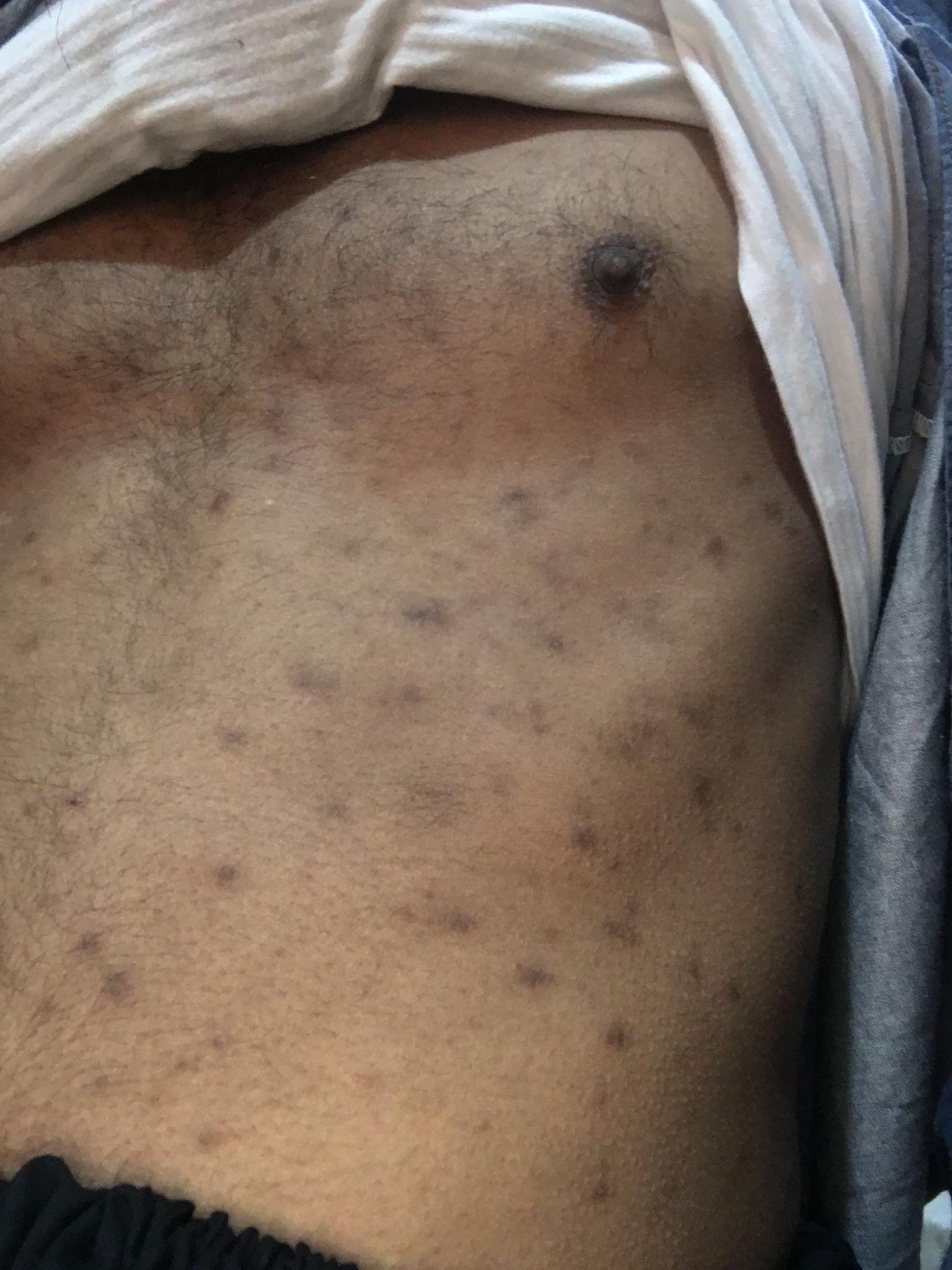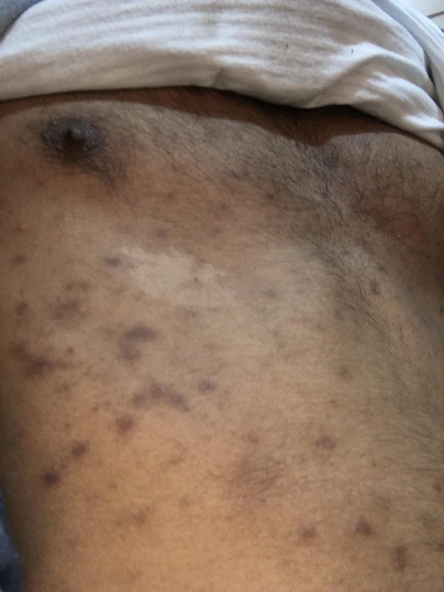This is called post inflammatory hyperpigmentation! Apply Natura E lotion on all over body and on pimples apply gentamicin cream morning and evening 2 times a day. And during shower apply ketoconazole shampoo all over body and rub for five minutes then wash it off,