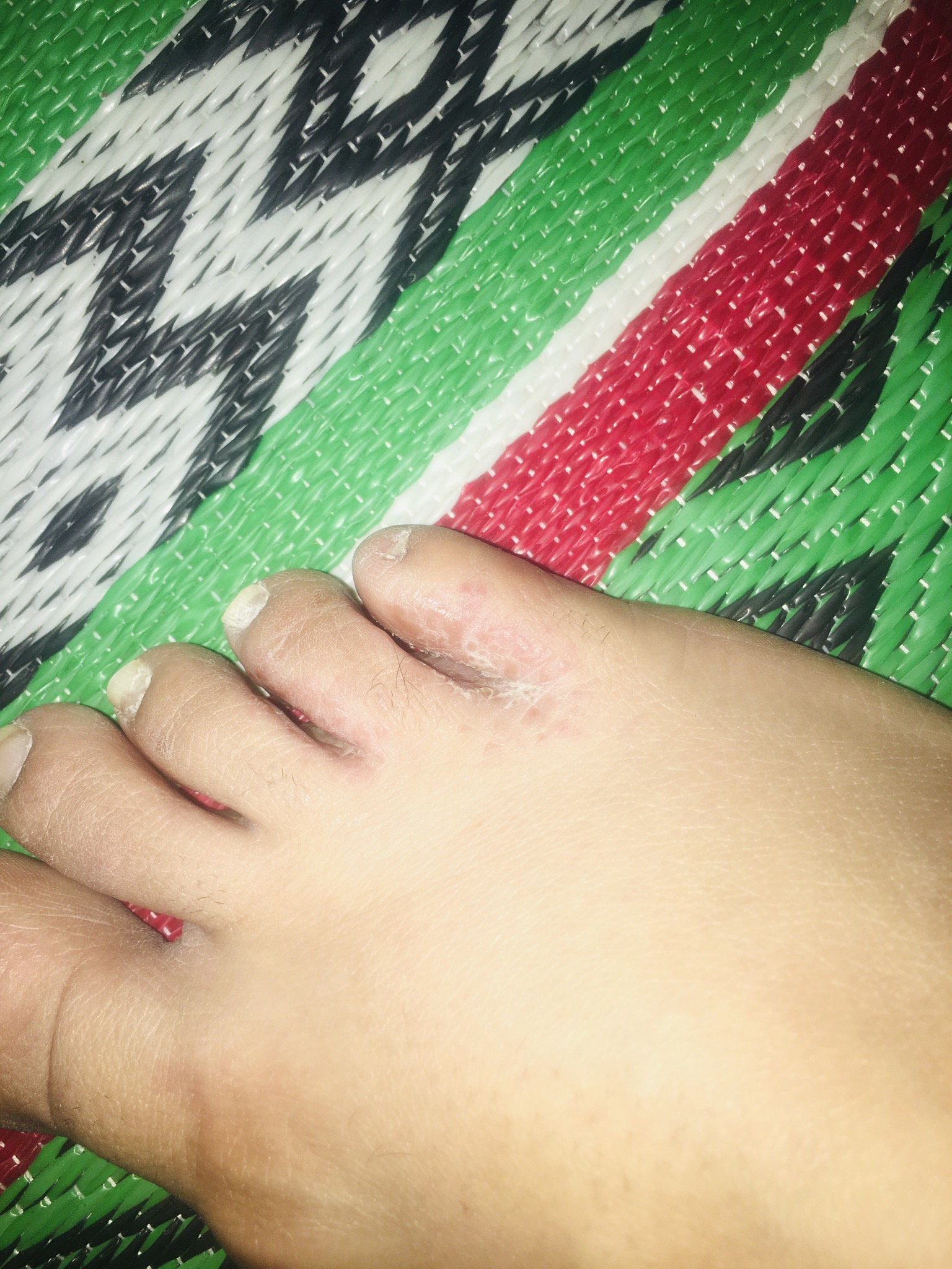This is most probably tinea pedis and needs immediate treatment. If u dont treat it in time, it will spread. U shld visit a dermatologist as it needs history n examination of the body to be sure of treatment. I dont think tht medication can be given like tht. Better to keep it dry. Visit a dermatologist to save from spread.