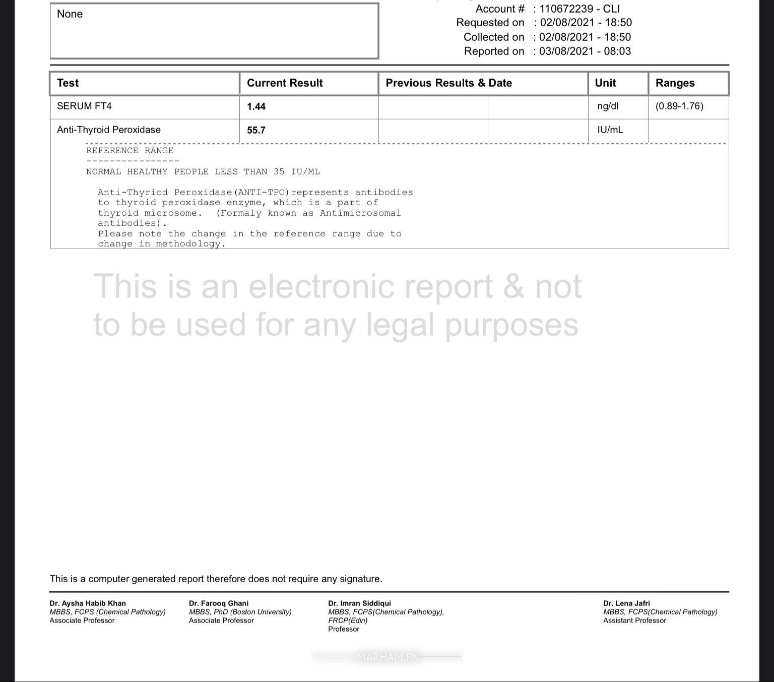 Antibodies positive (hashimoto’s) causing Subclinical hypothyroidism. As per guidelines you should be on thyroxine 50mcg once daily 1 hour before breakfast . Are you currently taking thyroxine?