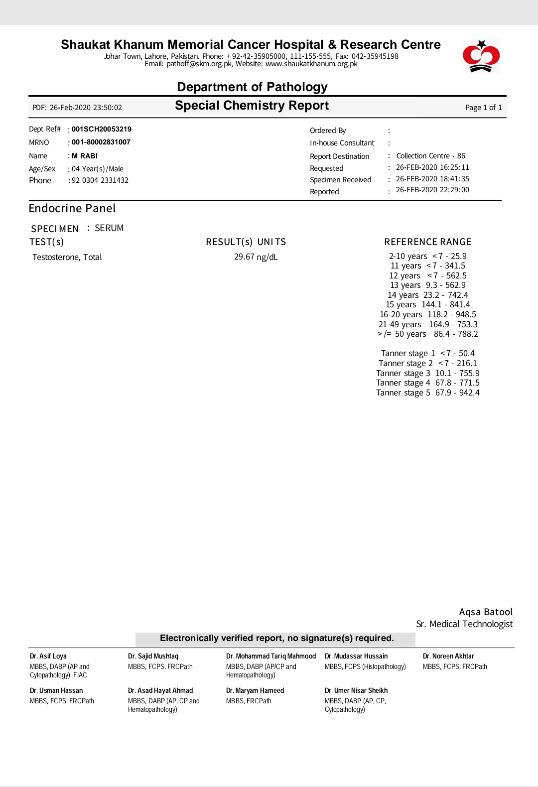 Salaam. Sir I've a son 3 years 10 months old. He has a problem with his growth. I've some of his test about Serum testosterone and I'm attaching it with my msg plz guide me what is it and what is the remedy. I'm worried alot about his growth. His height is 74cm and Weight is 7 kgs
