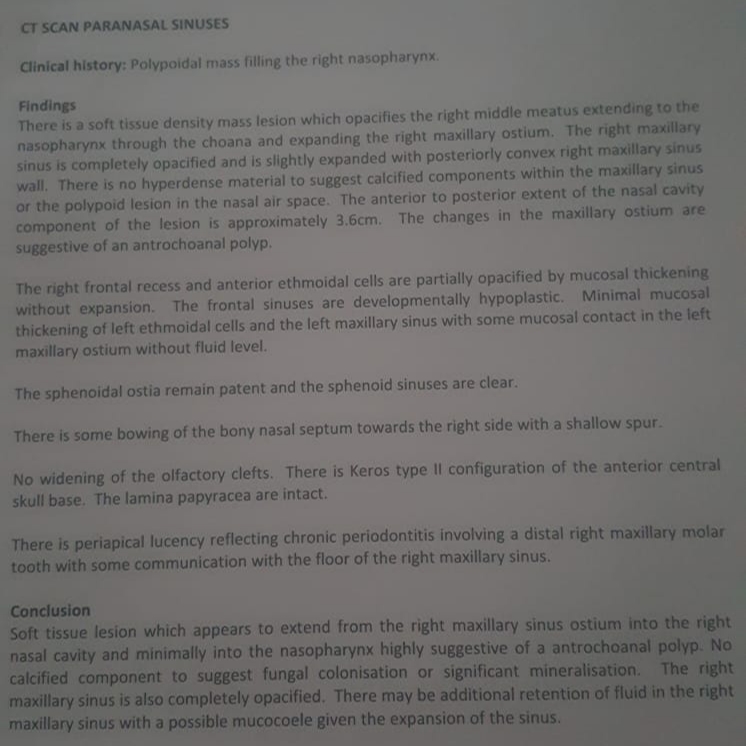Aoa. Your appears to have a specific type of polyp x called antro choanal polyp. Treatment is mainly done by FESS ( endoscopic sinus surgery)