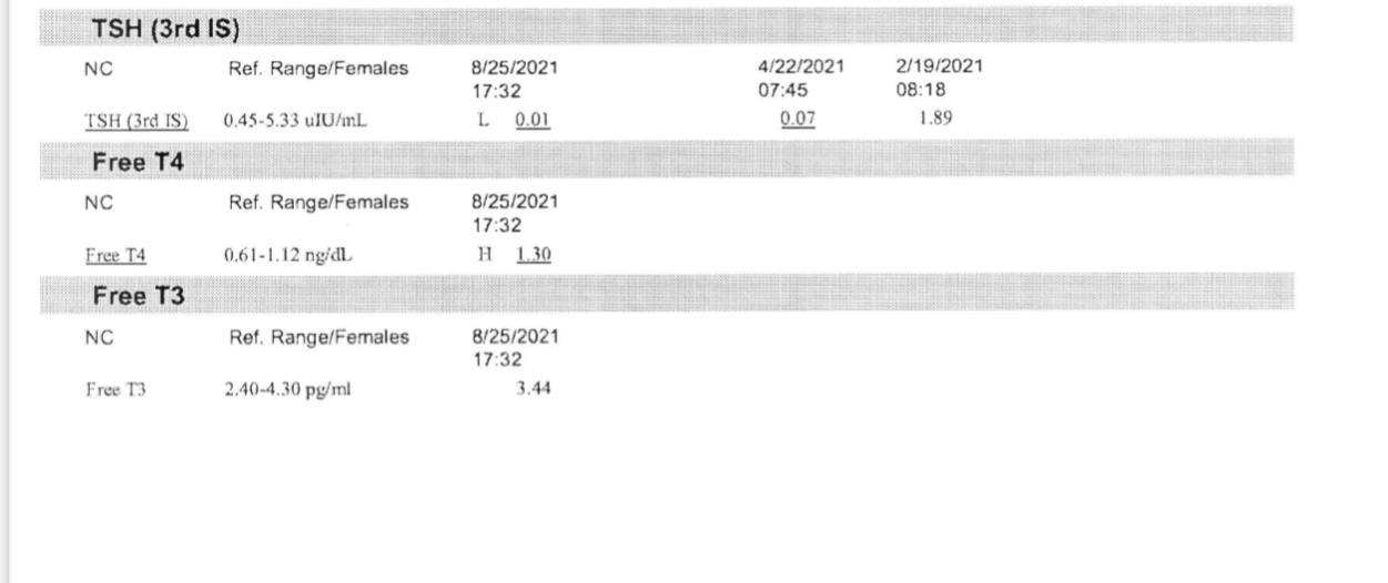 I was dx with Hyperthyroidism in Jan 2021 and been taking Levothyroxine 50 mg since then, went for retesting 2-3 months after that (report attached). Doctor told me to continue the same dose since t4 was coming back to normal and TSH was low but he said it would come back to normal on its own. After 3 months I went back for my reports but this time t4 is high and tsh is extremely low. What to do now?