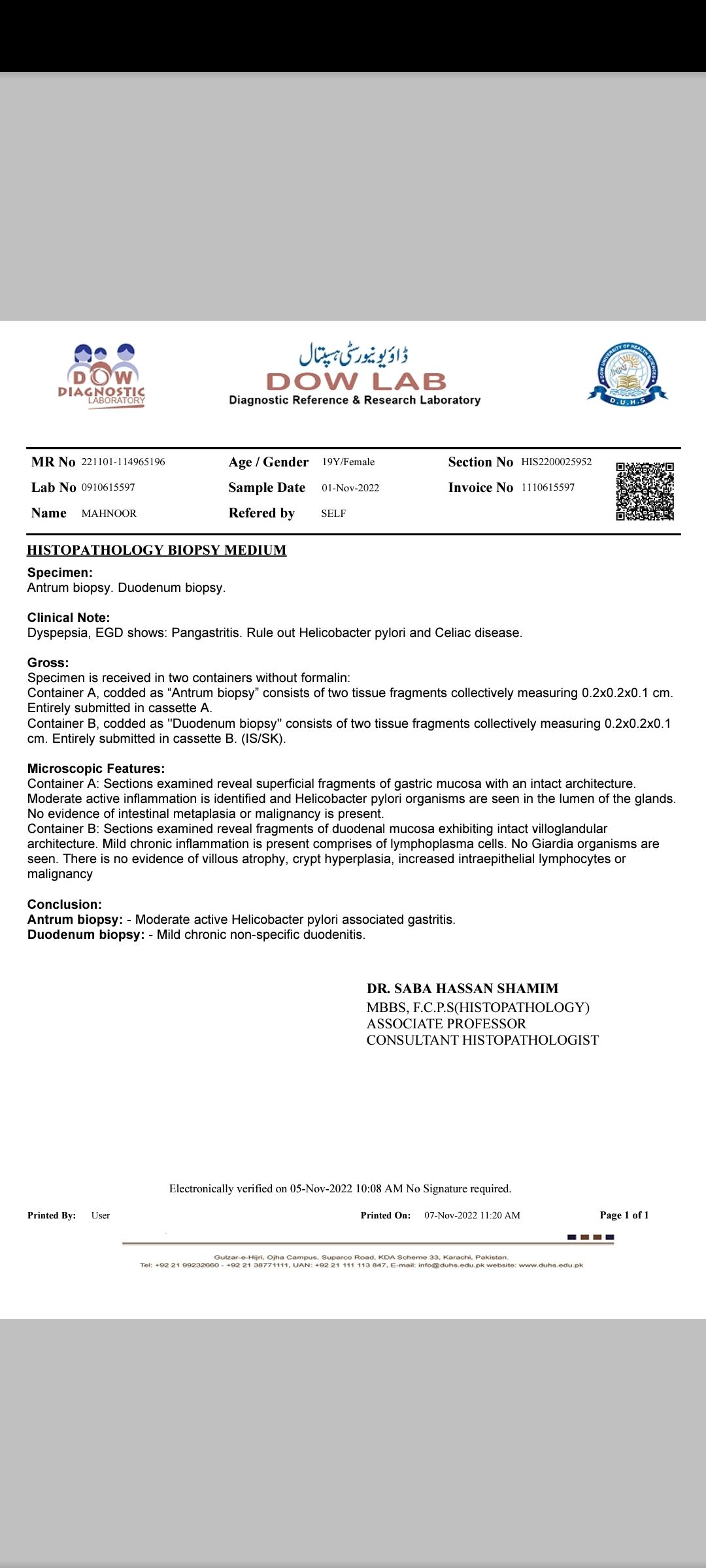 Meri beti ki age 19 year he aur us ko 3 Saal se stomach pain rehta tha Kafi docter ko dikhaya tha phir ab is ki endoscopy krwani pari endoscopy ki report shear KR Rahi hon kindly koi related doctor guide Karen k actual problem Kya he