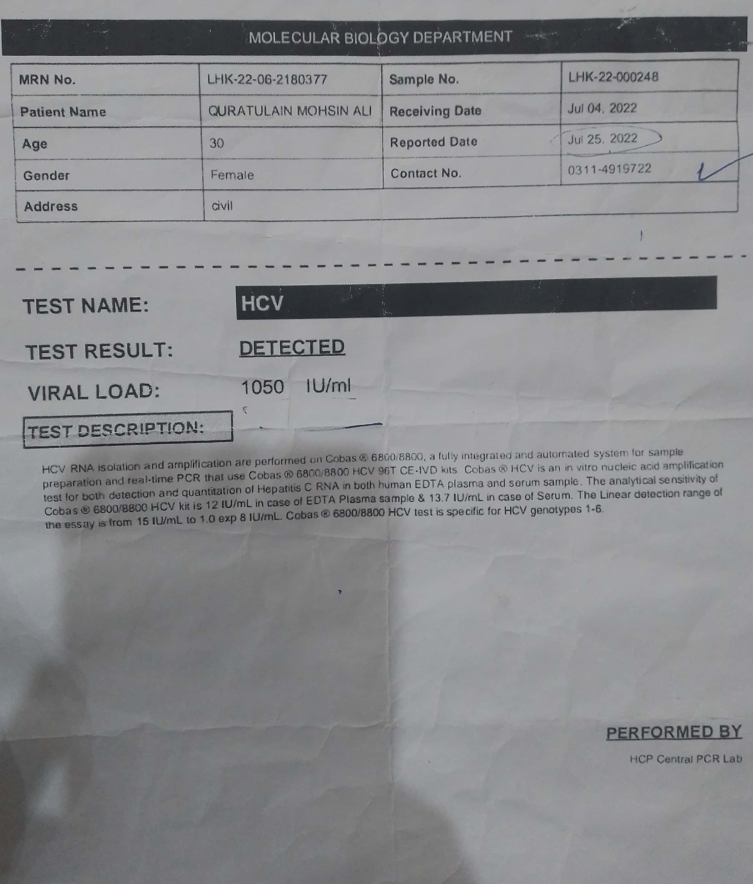 Ye Meri hepatitis C k + any py ultrasound report hai... please guide me what is the situation of my many percent it is effected? Can it be cure Easily as well 100%?? Note: lactating mother