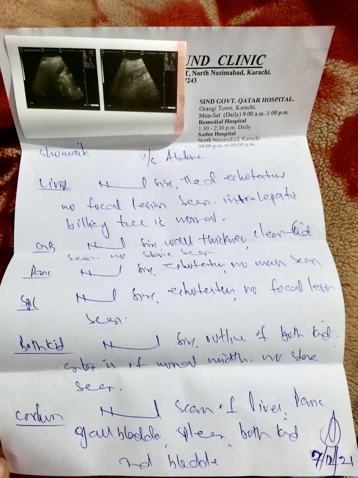 Ultrasound is normal. It means she just has stoma h issue regarding acidity and possibly leading to ulcer.