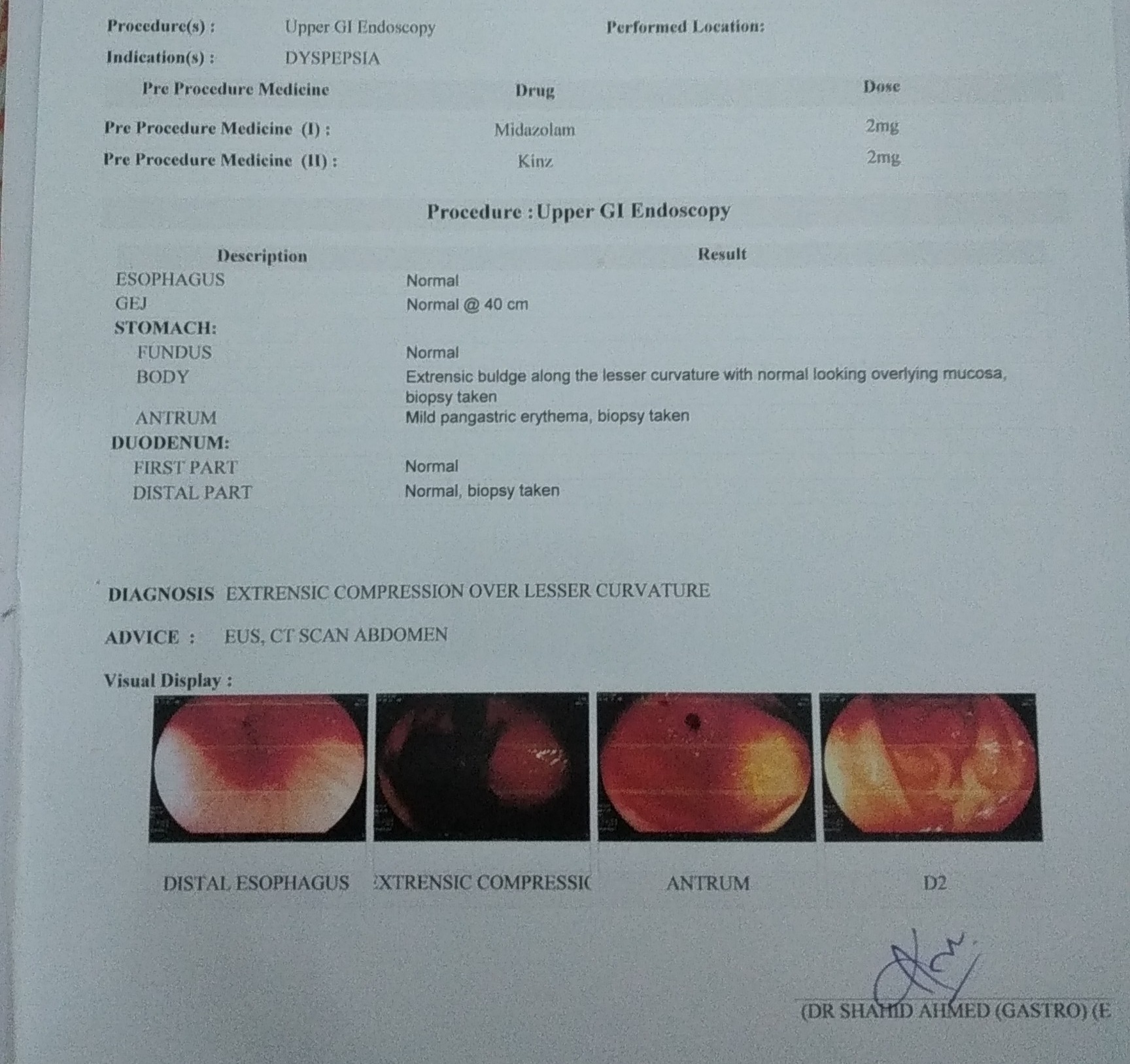 Went in for an endoscopy and found out that I have a stomach wall compression, did ct scan but it didnt show anything but there is a mass in my stomach in the lesser curvature and its palpable. Ct scan says its compression kindly tell me if its cancer so which stage is it? And it also shows colitis what should i do about this? Should i consult an oncologist for this? I have symptoms of loss of appetite and indigestion.