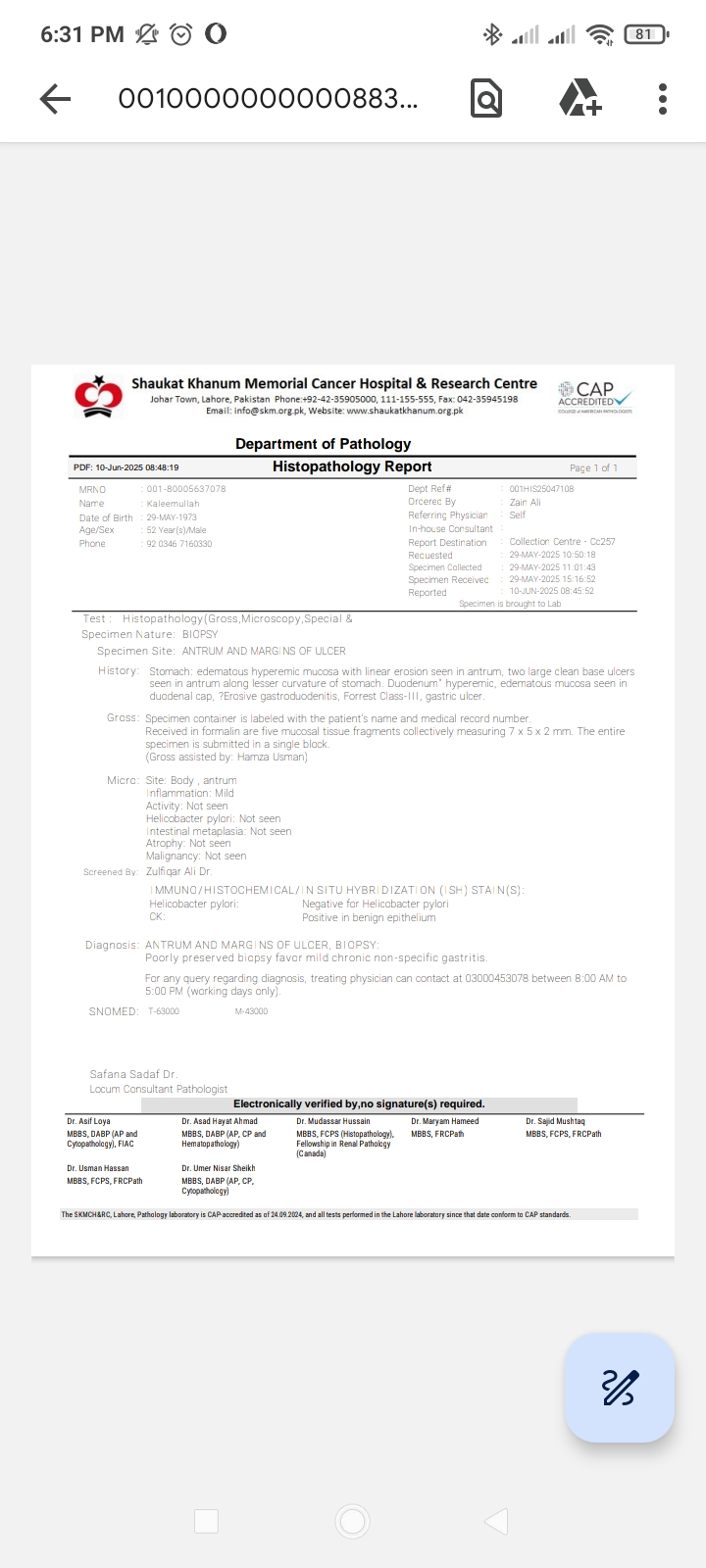 Choti aant ma gass bht bnti hy jis ki waja say bht pain hy Ulcers b hain biopsy b krwai hy report sath attach hy 3 din say constipation hy