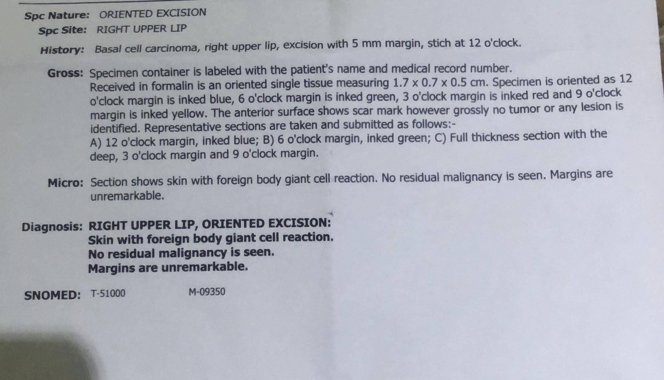 Here is a report of my mother she just removed basal cell carcinoma through incision this is the second biopsy if there is any doc here in group can she tell about this report plz???
