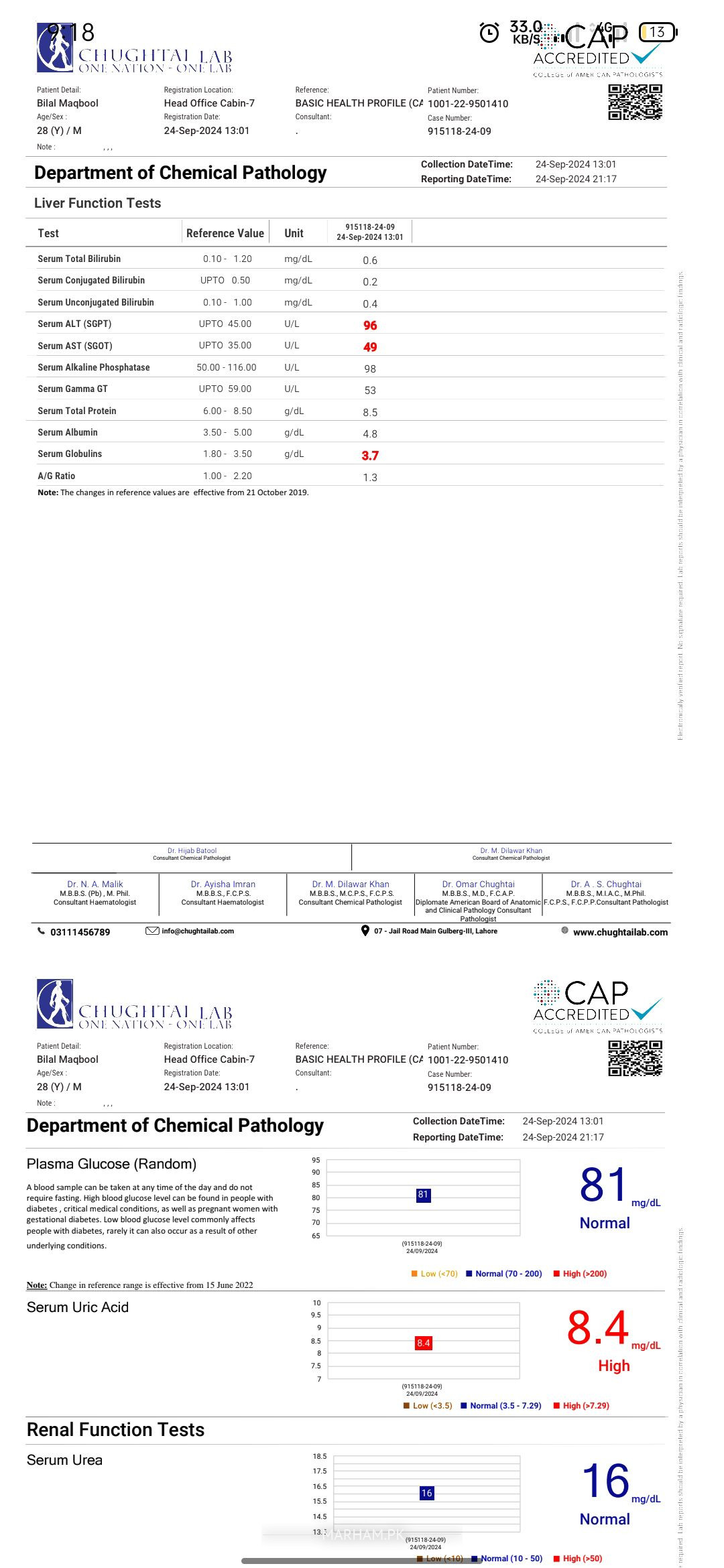 Asalamowalikum Bilal sb, i hope ur fine ur Basic reports like UDR,CBC,RBS, are normal but Uric acid is high that may cause pain in your joints, SGPT is high , may u have viral infection so you need to use medication for ur disease and you will be alright. You have pain in joints or not? Dr Sikandar Here