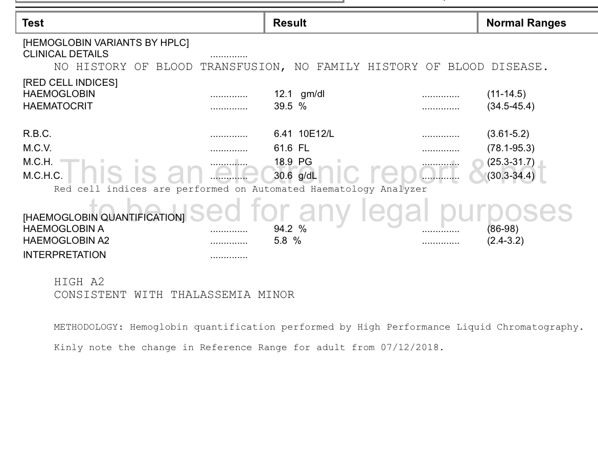the patient have thalassemia minor according to the the report