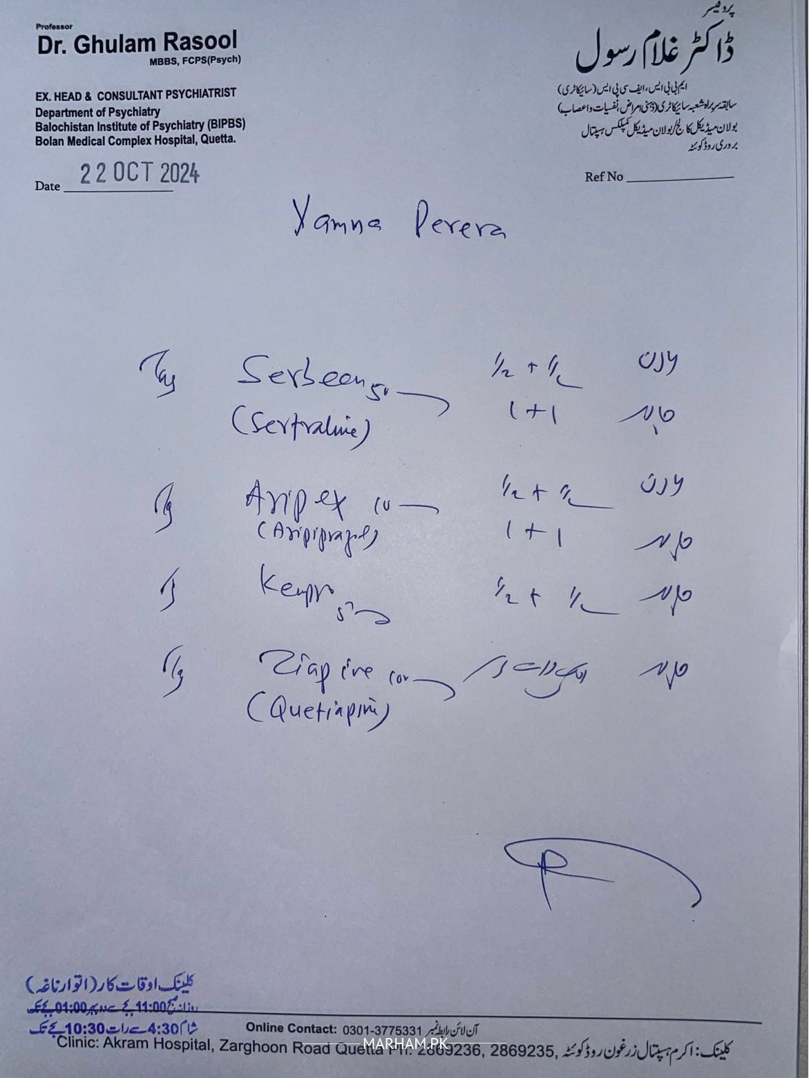 Tab serbeen 10 mg ,1/2 at day time and 1/2 at night time for 6 days. Tab ariprex 10mg , 1/2 at day time and 1/2 at night time for 6 days. Tab kempro 5 mg 1/2+1/2 Tab ziapine 100mg 1/2+1/2