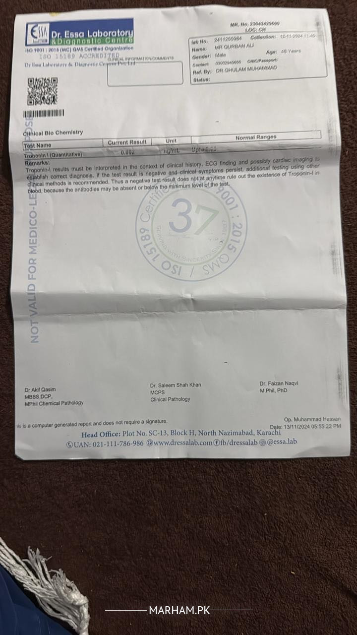 unka ecg kerwaye app ne. baqi tests normal hain lekin cholestrrop barha hua he. kindly avoid fatty foods, too much sugar and too much of red meat. kab se he chest pain aur kitni dair raha ? also whats his blood pressure?