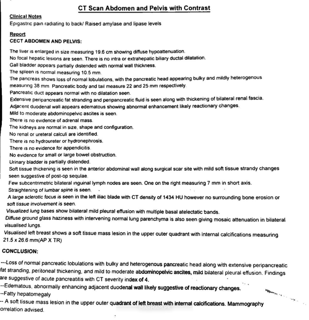 acute pancreatitis fatty liver breast mass (further investigation ki zarorat ha )