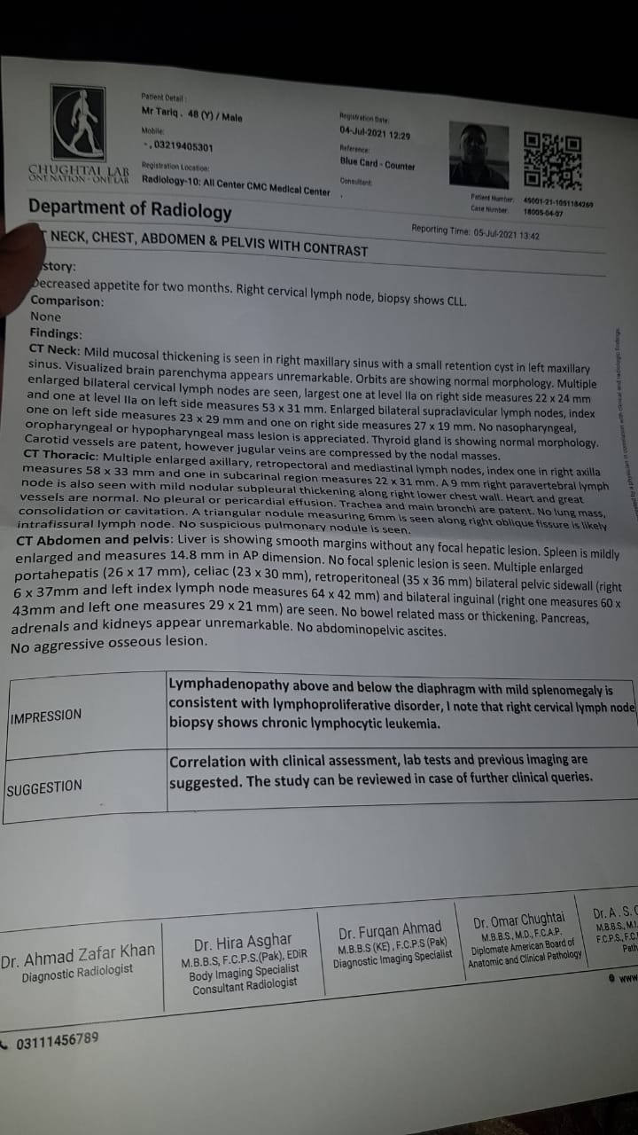 My uncle has been diagnosed with CLL (stage 3). The doctor has recommended chemotherapy + rituximab as treatment. I would like to know whether the treatment is right. His reports are attached below for your reference