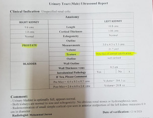 Please check the attached ultrasound report. Is it normal. Kindly tell about the "Few foci of central calcification" in Prostate. Any other tests or any medicine needed.