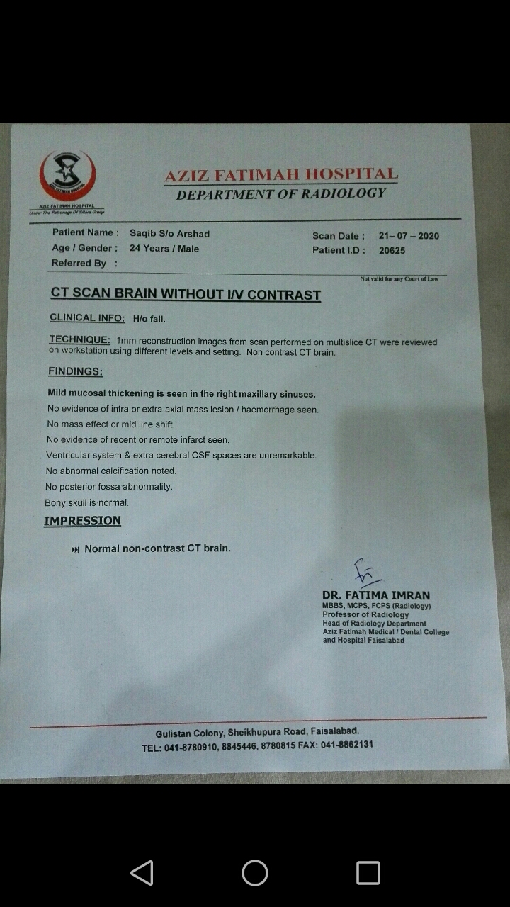 Fall from stairs 6 months ago, headache and vertigo at that time but I was ok from two months but now that pain started again from two weeks 24/7 all the time. Ct was also ok that time. CT Report and prescription attached of july 2020. Kindly give me a good advice and why this starts again, thanks.