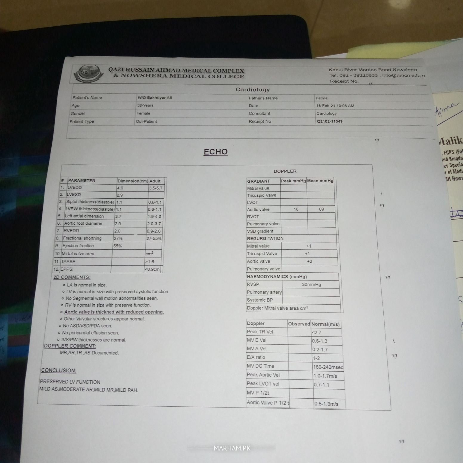 arotic valve is thickned with reduced opening doppler peak 18 mmHg and mean 9mmHg is k keya matlab hy meri ammi k report hy age 52
