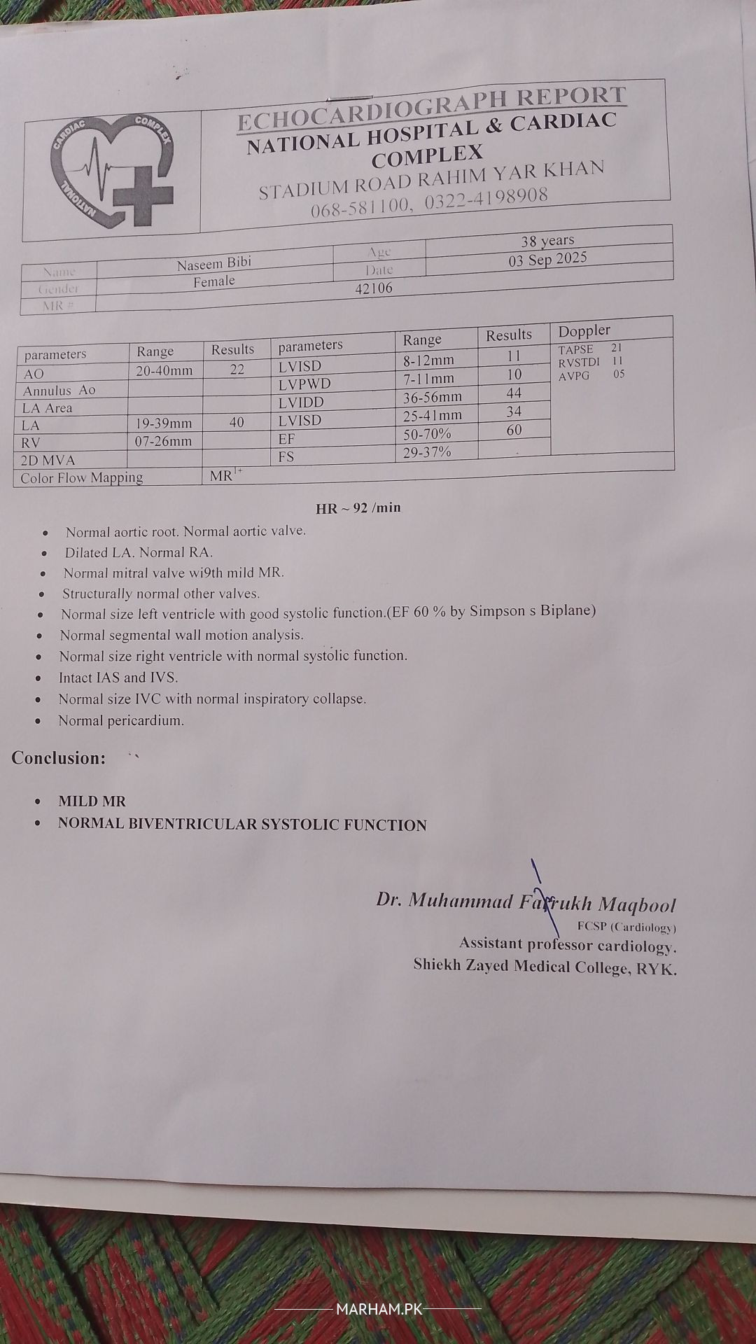 Asslam O Alaikum dctr meri ami heart patients hein main agr unki kuch Reports share krun ap plz mjhy guide kr skty kuch Ye un ki aik report hai frst time checkup kraya Ecocardiogram kraii tu dctr ne bola k dil ka aik wall leak hai medicine unho ne dii but koi farq nii hai