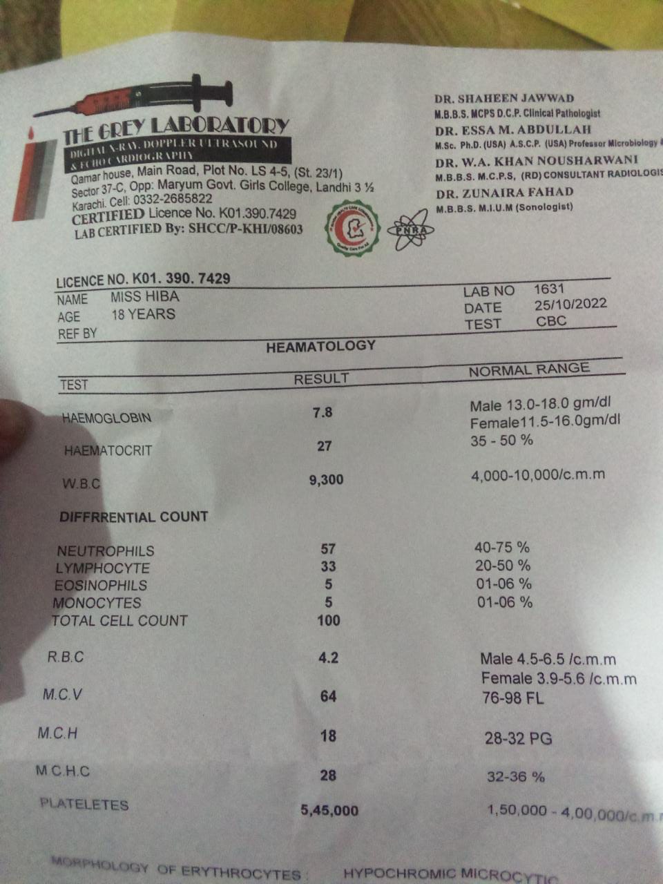 Haemoglobin = 7.8 W.B.C = 93,00 lymphocytes= 33 R.B.C = 4.2