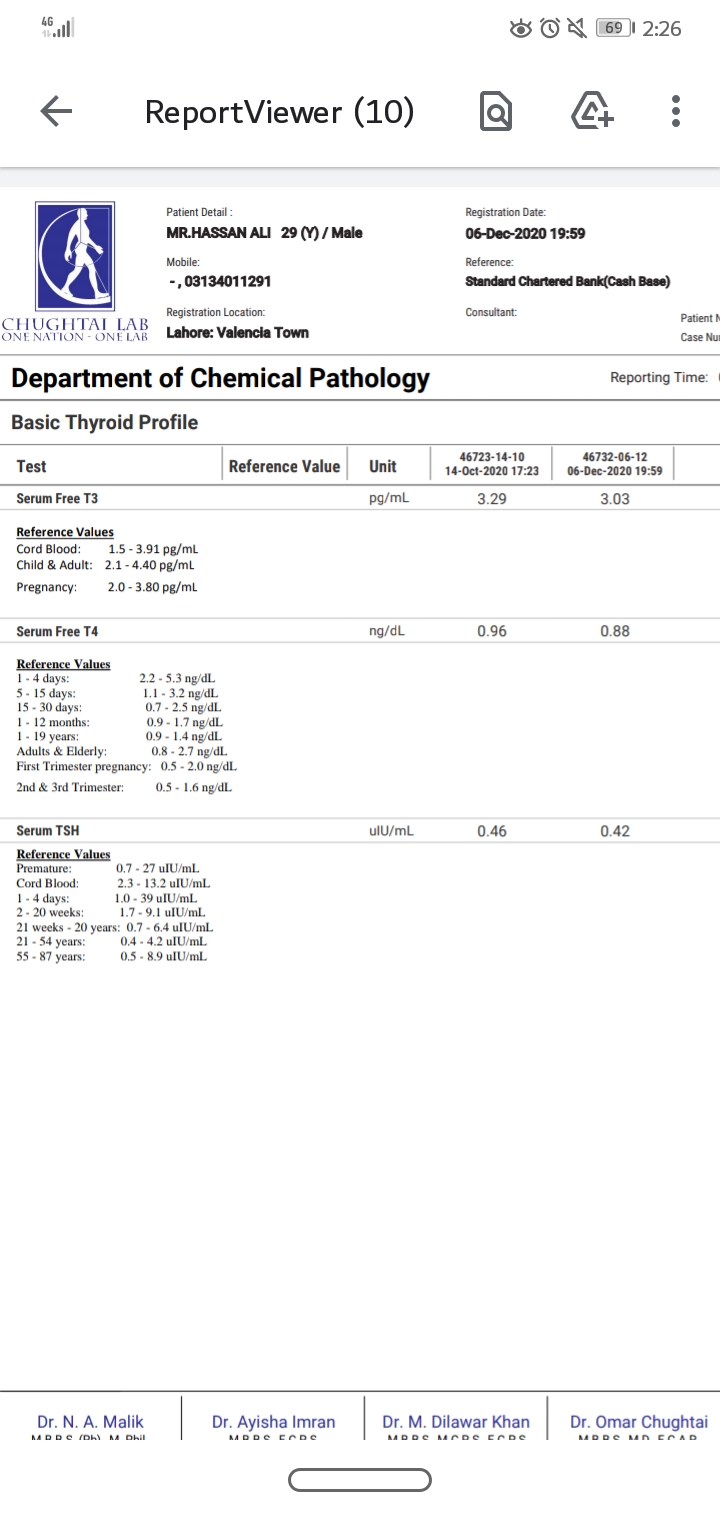 Due to numbness and shivering in body i went to general physician who prescribed me berocca for 3 months. After that my tsh was 0.46. He then prescribed me neomarcazole for 6 weeks and now my tsh has more dropped to 0.42. I have attached my lab result which shows the trend of last 2 events.