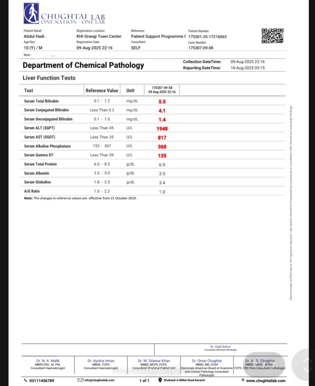 Hello, as my younger brother having health problem from last week, vomiting and strange behavior so doctor recommended me for LFT and according to tests report everything in that tests are higher in number which indicates that he has a symptoms of jaundice. Im attaching his reports here. Kindly do let me know if its alarming situation or he will recover it.
