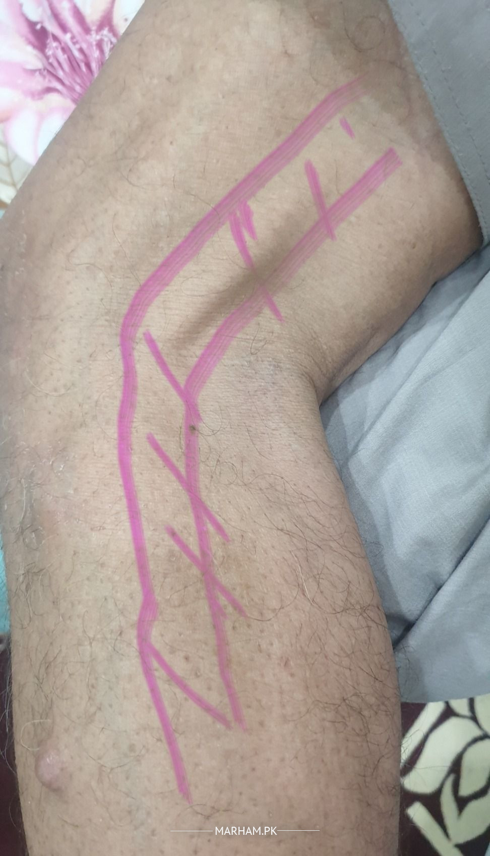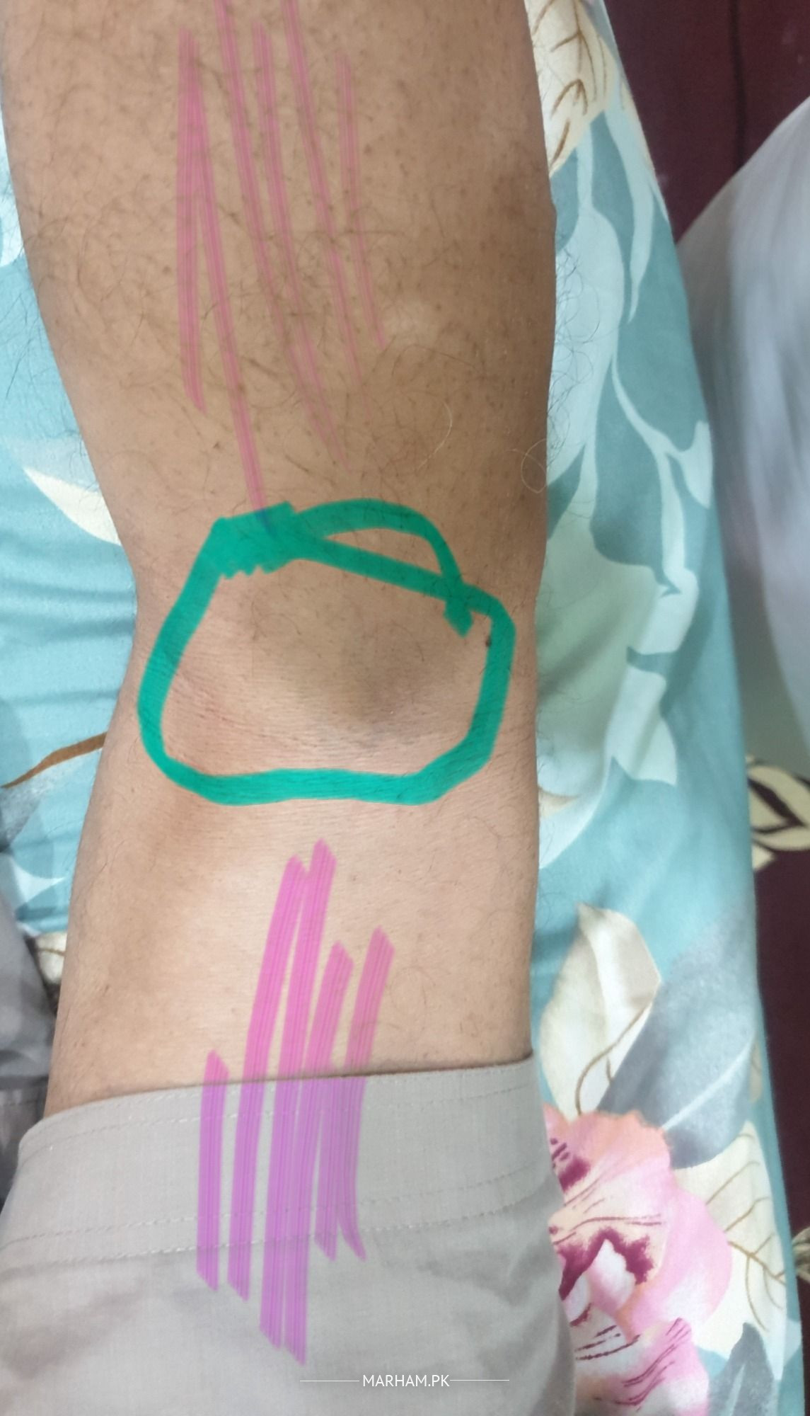 Leg Pain While Walking. Pink Area in pain while muscles are extended. Blue Area (back of knee) where pain originates. Tried massaging but didn't help. Any remedy Guidelines would be highly Appreciated.