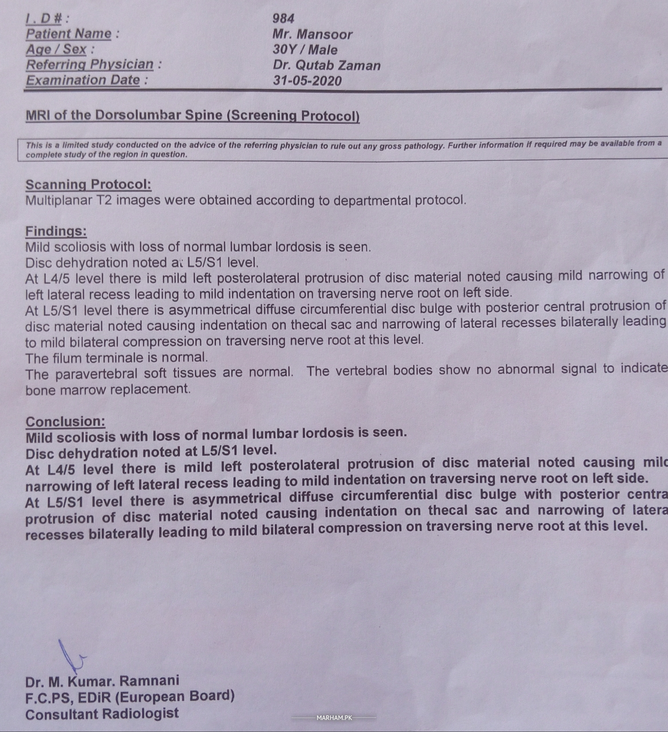 asak this not a good sign do mri screening of lumber