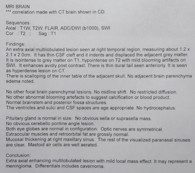 Hello Drs, I am a PhD student and 35 yrs old. My blood pressure raised to 184/124. In my CT-Brain report the doctors concluded that "Extra axial enhancing multilobulated lesion with mild local mass effect. It may represent a meninjoma. Differentials include cavernoma" . The size was observed at right temporal region measuring about 1.2 by 2.1 by 2 cm. Only CT brain has been taken, without any biopsy of brain. Until now, I am not feeling any type of severe pain, except pain in my legs, and my back side. no signs of memory loss, vomiting or severe weakness. but my blood pressure is 140/100. I have conducted heart CT scan as well and it is fully normal. Can anyone suggest me a good neurosurgeon in Pakistan or Malaysia. Currently studying Malaysia but want to come to Pakistan for treatment. Here, In Malaysia Doctors have suggested robotic surgery but because of high cost, I cannot do it in Malaysia.