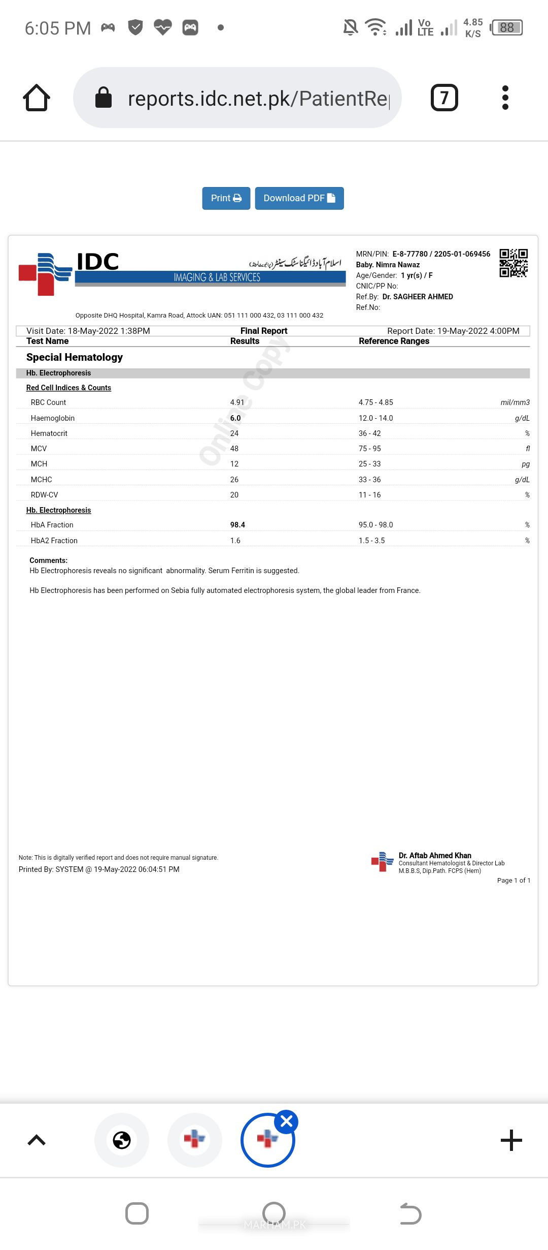 میری بیٹی جس کی عمر ڈیڈھ سال ہے ۔اس کی یہ رپورٹ کیسی ہے اور کیا اسکا جسم خون بنا رہا ہے یا نہیں ۔ خون کم ہے تو کیا علاج ہے مزید معلومات بھی دیں ۔ اور کونسا فروٹ بہتر ہے اس رپورٹ کے حساب سے شکریہ