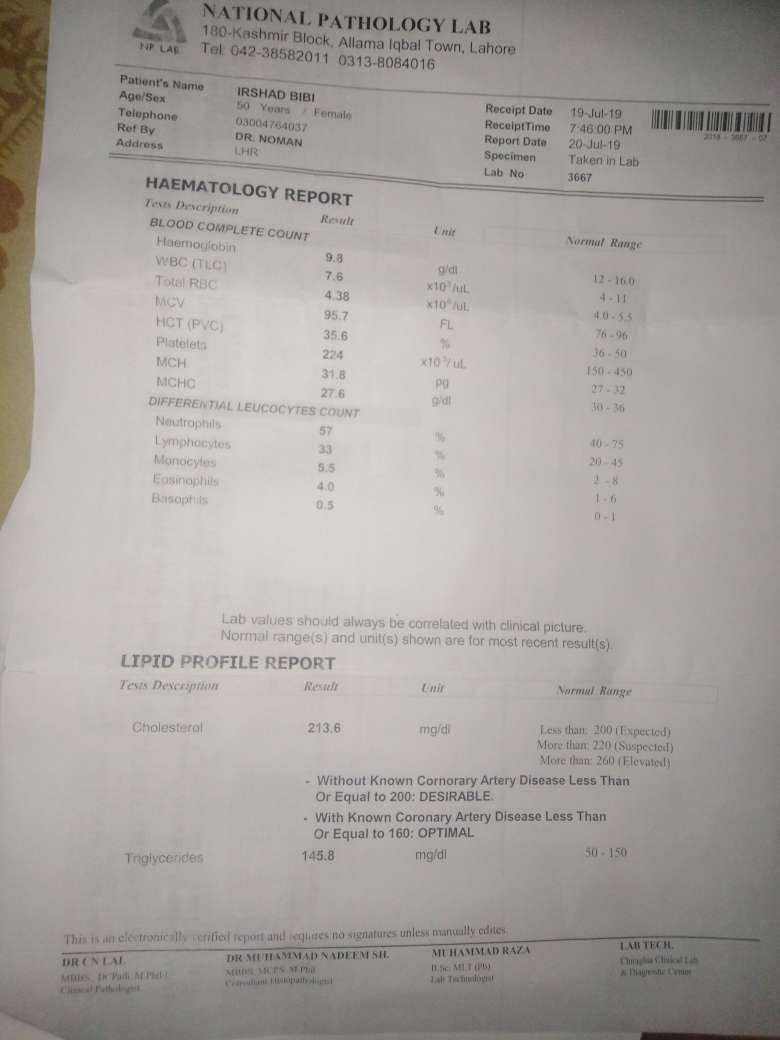 Salaam. May Allah bless her with early recovery and health.. Please do hepatitis b and c tests and ultrasound abdomen.. Till then please use tablet diagesic P one tablet suba dopair sham as needed for Pain... Capsule nexum 40 mg aik suba before breakfast.. Tablet myolax 4 mg suba sham. Tablet citanew 10 mg after breakfast. Injection introp-D 1 injection every other day ( drink injection in half cup of milk). Total 4 injection.