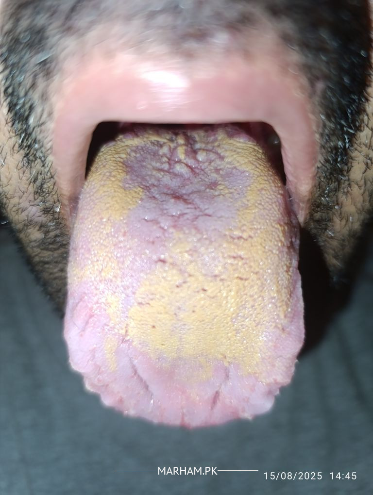 aap apni blood sugar test karwaen, aap ko tongue per thrush horaha hai jo fungal infection hai. nilstat drops lagaen (swish andswallow )