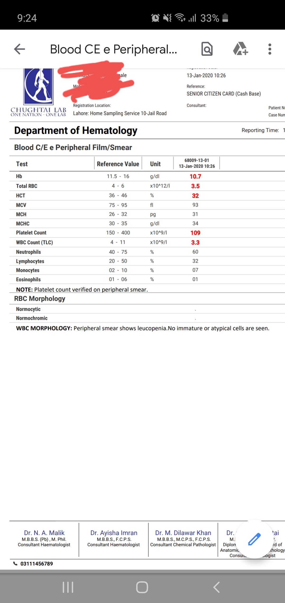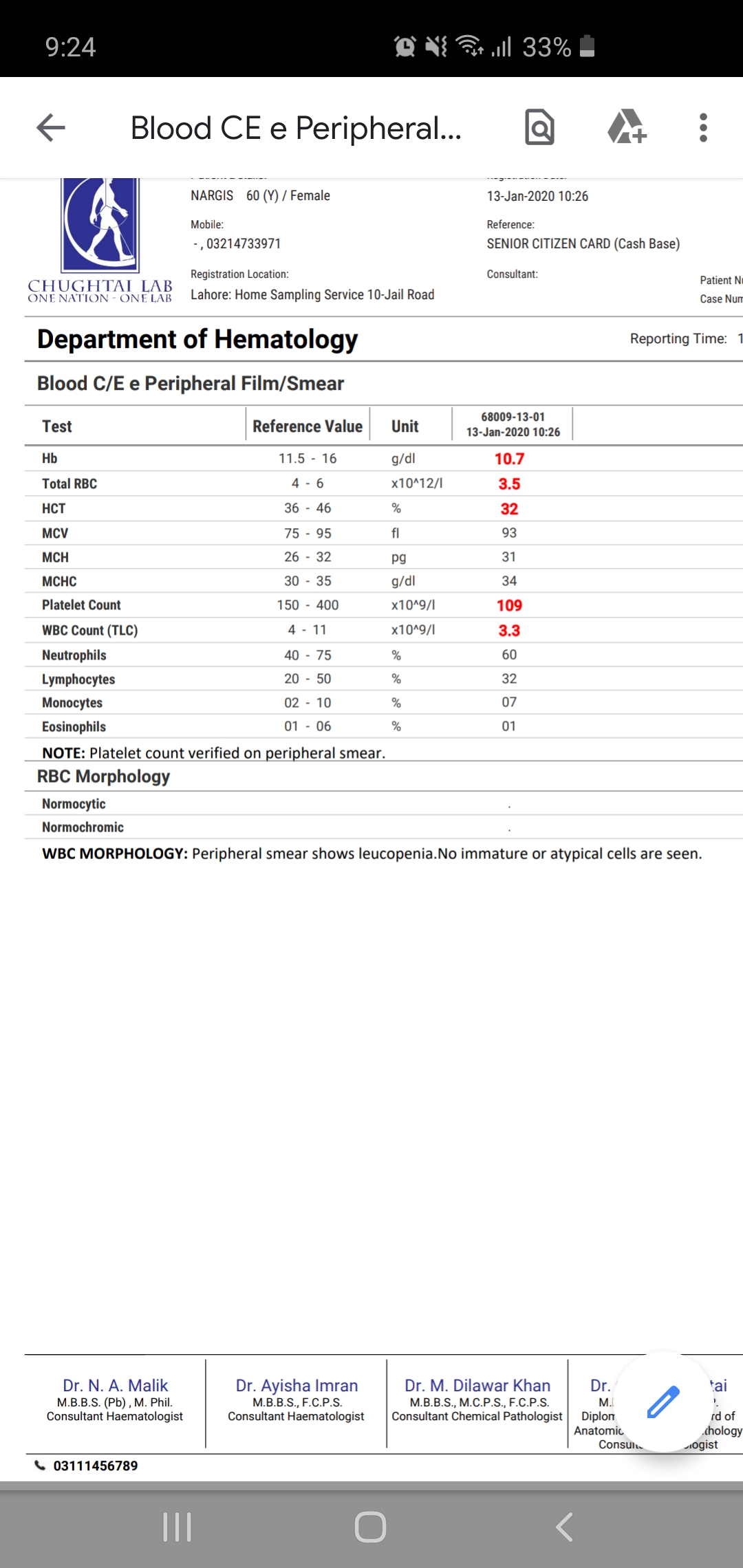 Patient is using nirvanol tablet 2.5 mg daily. There's decrease in platelets count. Platelets count history on 25Nov: 104 5dec:101 (after 5 December patient took folic acid one daily and stopped takingn nirvanol) 22dec: 120 count Now patient again started nirvanol as prescribed by doctor but platelet count is again 109. Reports are attached. Kindly also tell me about blood picture test if it is ok or not