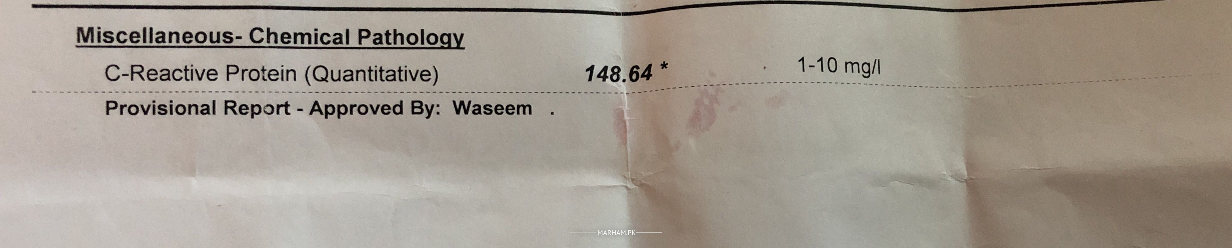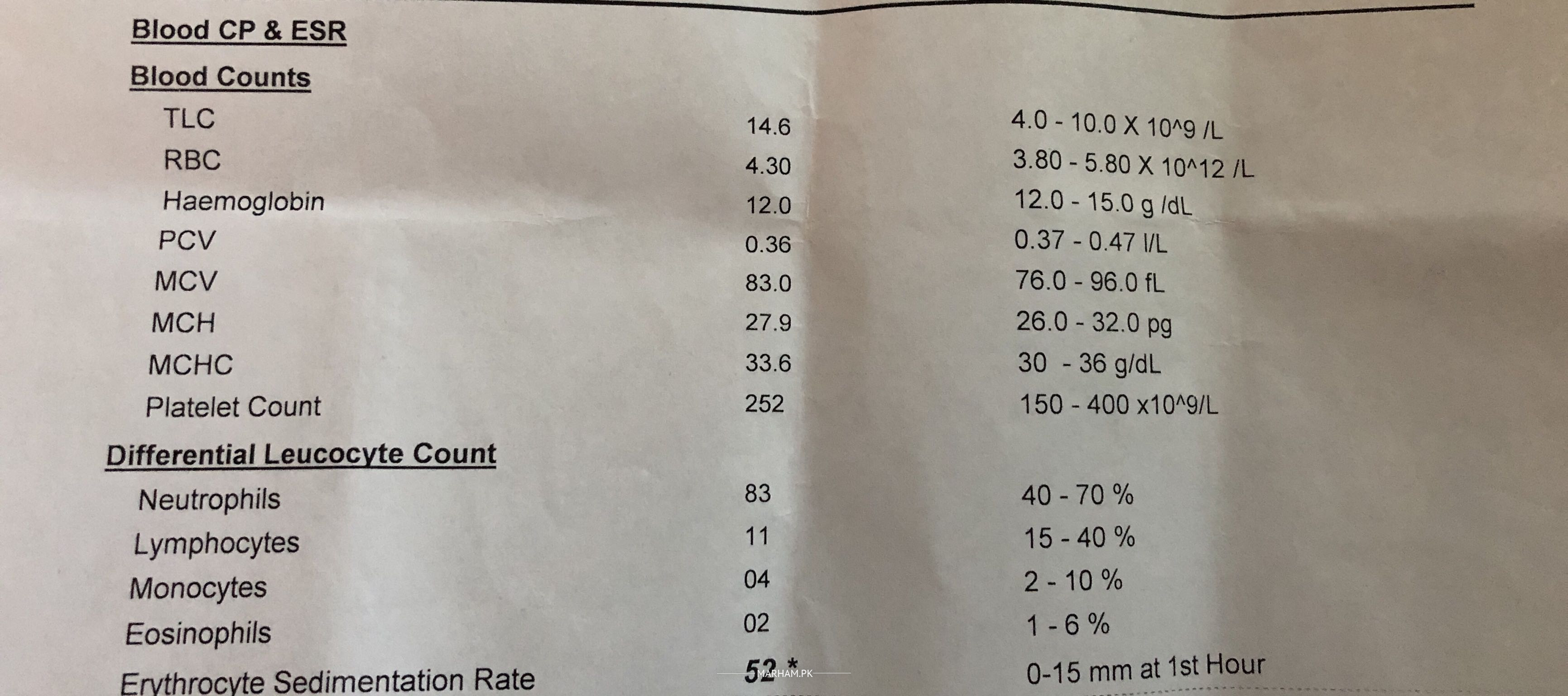 My wife got sever fever 101-103 on 21st Mar along with headache , body aches and lethargy. During fever her throat used to hurt but otherwise it was fine. For two days we battled fever and brought it down to 101 after which it subsided and kept it under control with panadol. Her blood reports came in with fol results C reactive protein quantitative 148.64 , serum ferattine 347.5 , erythrocytes sedimentation rate 52. Lungs X-ray shows clear. What could be the problem.
