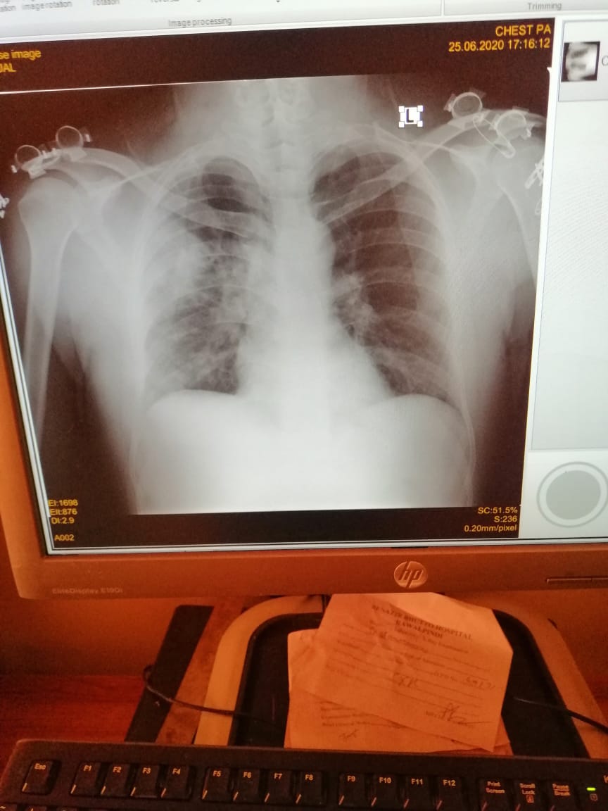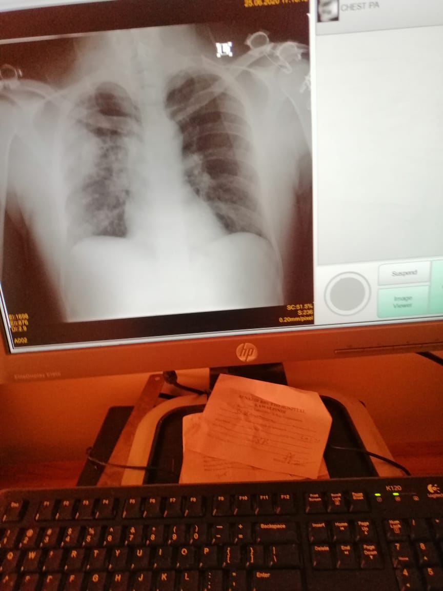 x-ray chest is very bad. please do his CRP CBC procalcitonin ferritin levels LFTs and start him good antibiotics tab me moxiget 400mg OD tablet Panadol injection indrop D once every alternate day for a week than once a week for 8 weeks in warm milk. tab qalsan D x OD tab surbex Z daily keep him in prone position. take him to the hospital as soon as possible for further management