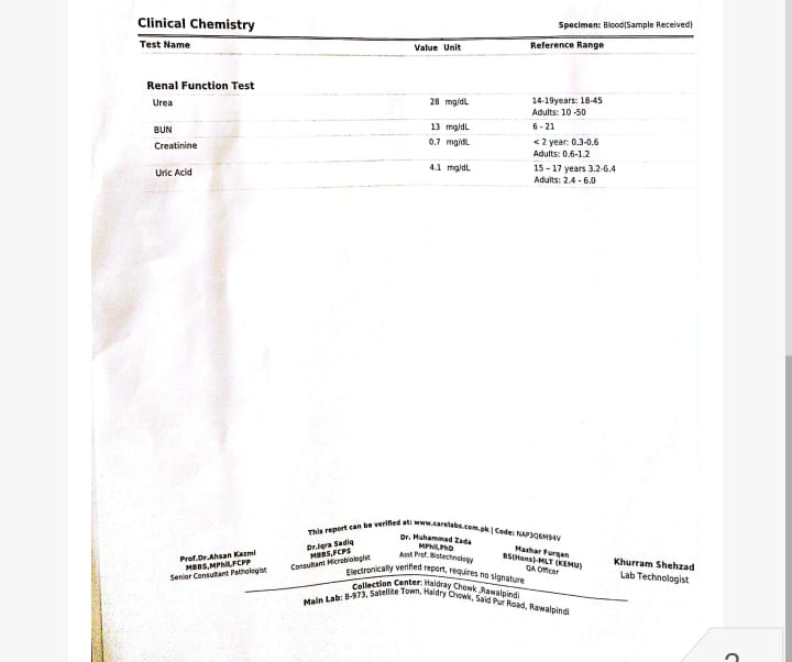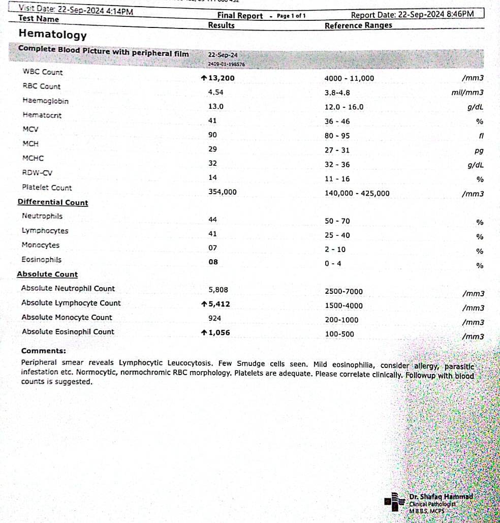 I'm from rwp. Kindly see the blood test i have uploaded and recommend me further test if any and also medicine, please