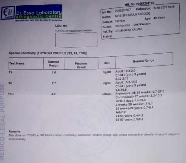 It is not saying anything because reports don’t speak but patients do . Every report is interpreted in context of reason for that test . So more important than posting test report is why this test was requested by the was purely based on numbers this is normal report. I totally disagree with my colleague there is no added value of free t3/4 with given results . TSH is on it own reasonable predictor of thyroid status