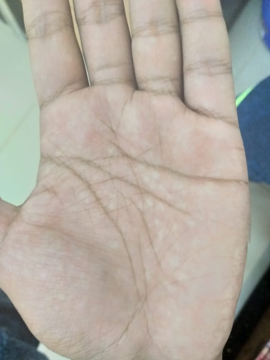 He went to the pharmacist and told him that he has white patches on his hand as well pharmacist said he has maybe calcium deficiency .