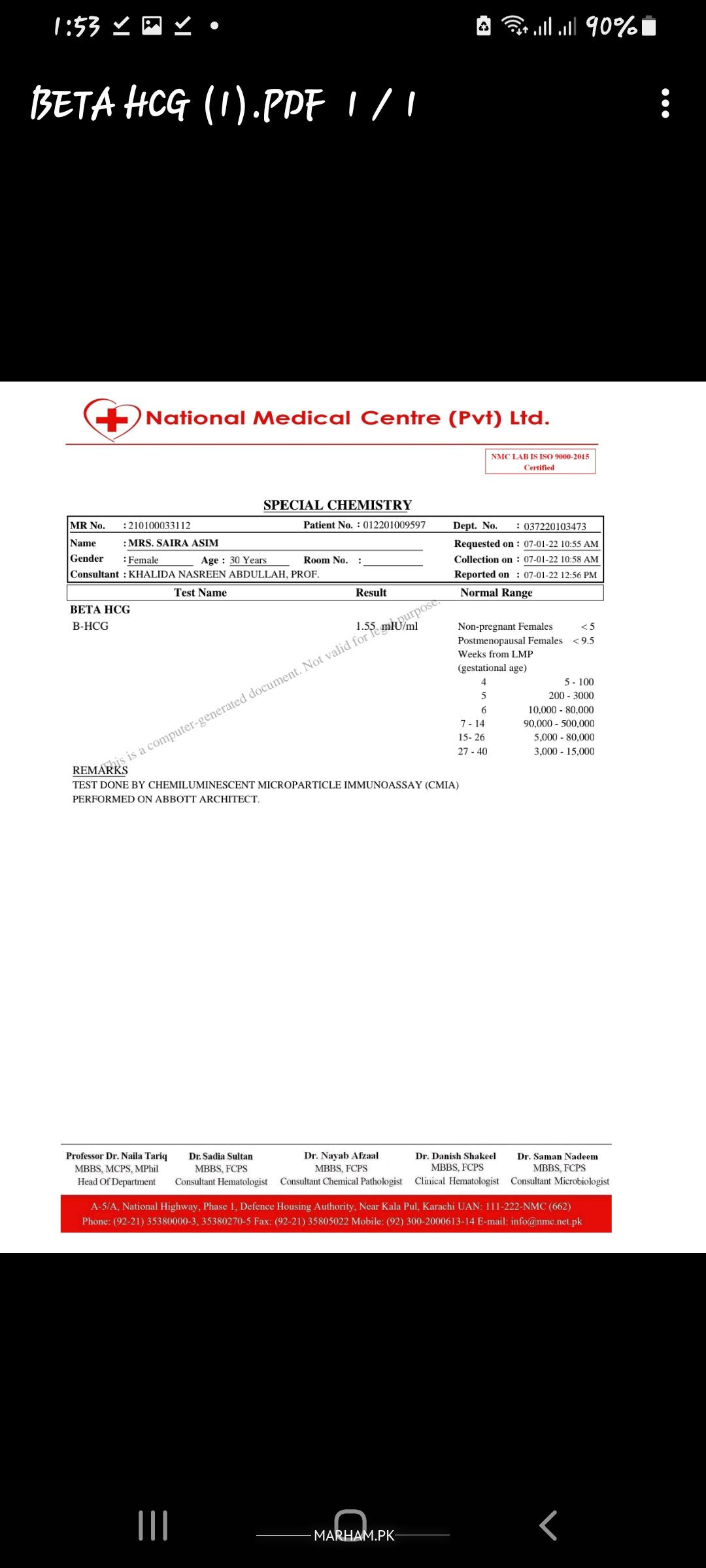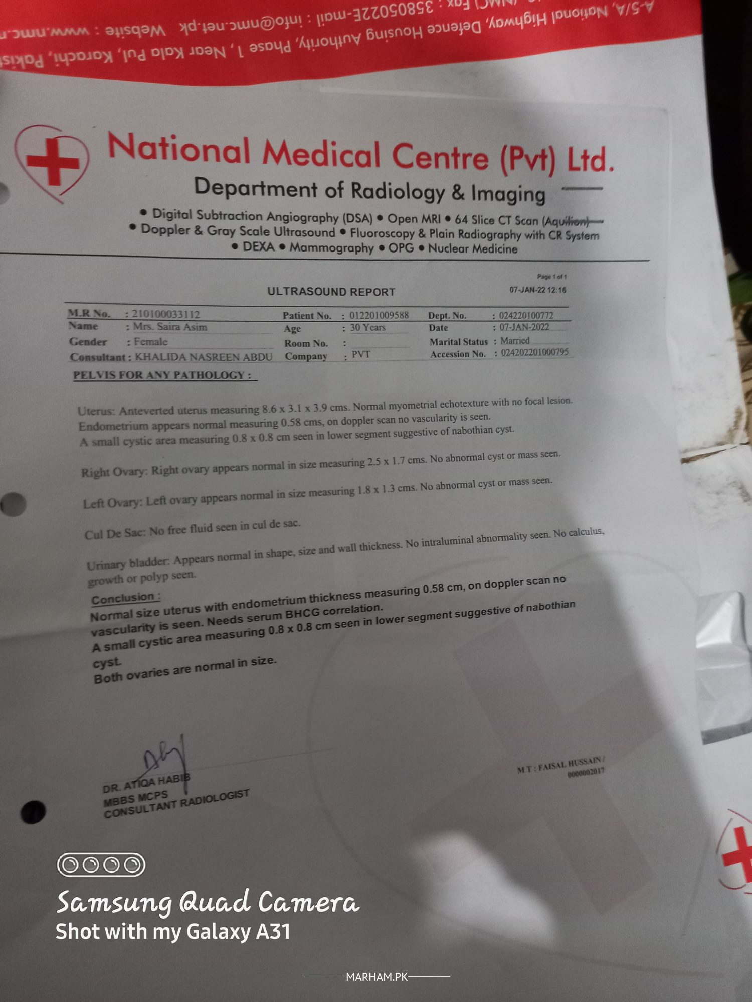 mai pregnant the with peri sac bleed, or gradually bledding bhrti ja rhi the. at the end DNC hui 15 week pregnancy me due to some complications, us k baf bleding nhi ruk rhi the or bleding or cloting the again DNc kr k safai bleding to nhi he. 2 weeks bad maine ultrasound krwaaya he .or serum beta HcG. wese DnC ko ak month hogya. lekin nechy ki trf bht pain hota see my reports and suggest. Thanks